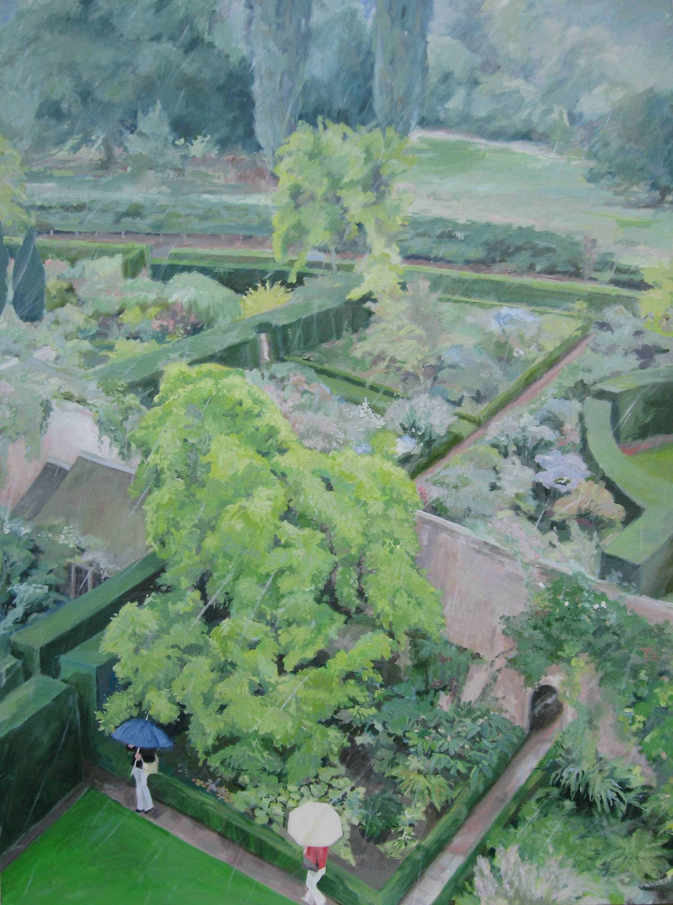 From Vita’s solitary tower in the center of the gardens I looked down on her secluded world and got a new perspective. I could see the few visitors weave through the paths under their bright umbrellas. Occasionally they would meet. This was the inspiration for “The Encounter”, an oil painting I did in the year following my visit.
