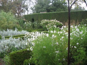 In the painting that I did from this enclosure, I inserted a mysterious figure moving through the garden. I also increased the moodiness of the scene. I could only imagine past visitors finding their way through the mist to the rose arbor. And I wanted it to look like dusk, when white gardens look their best.