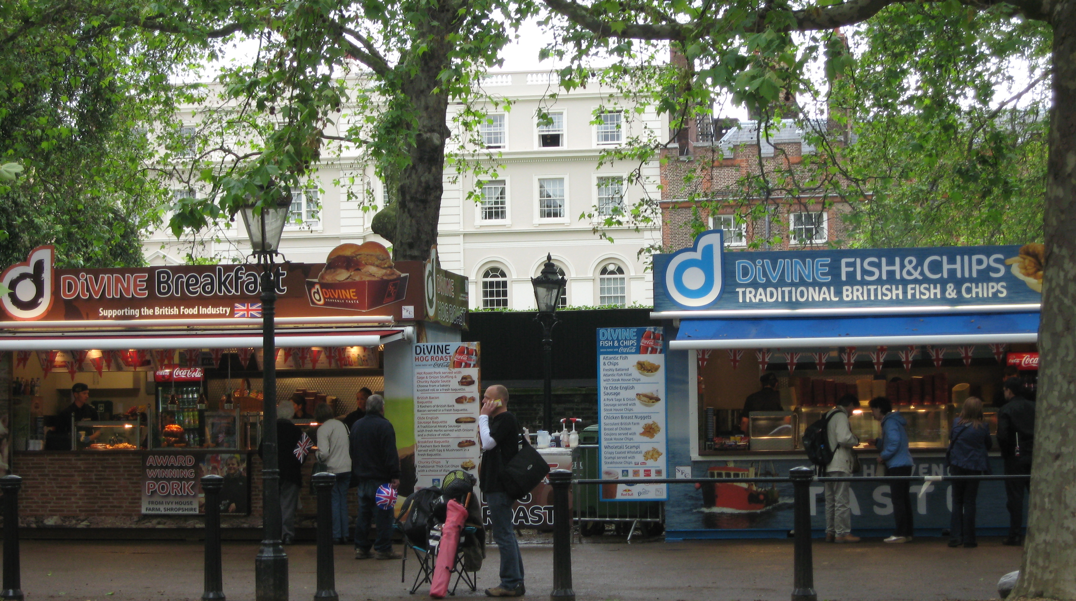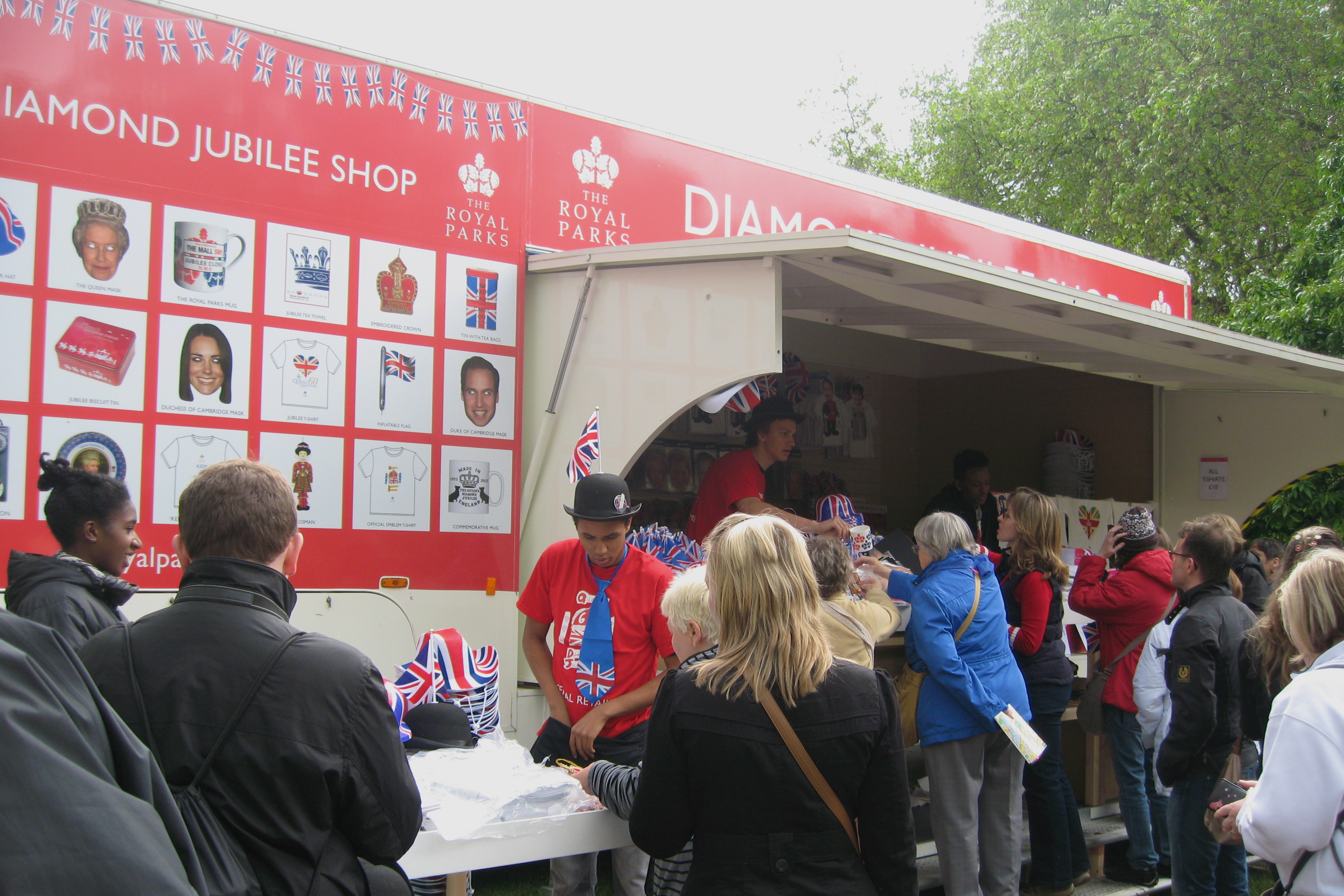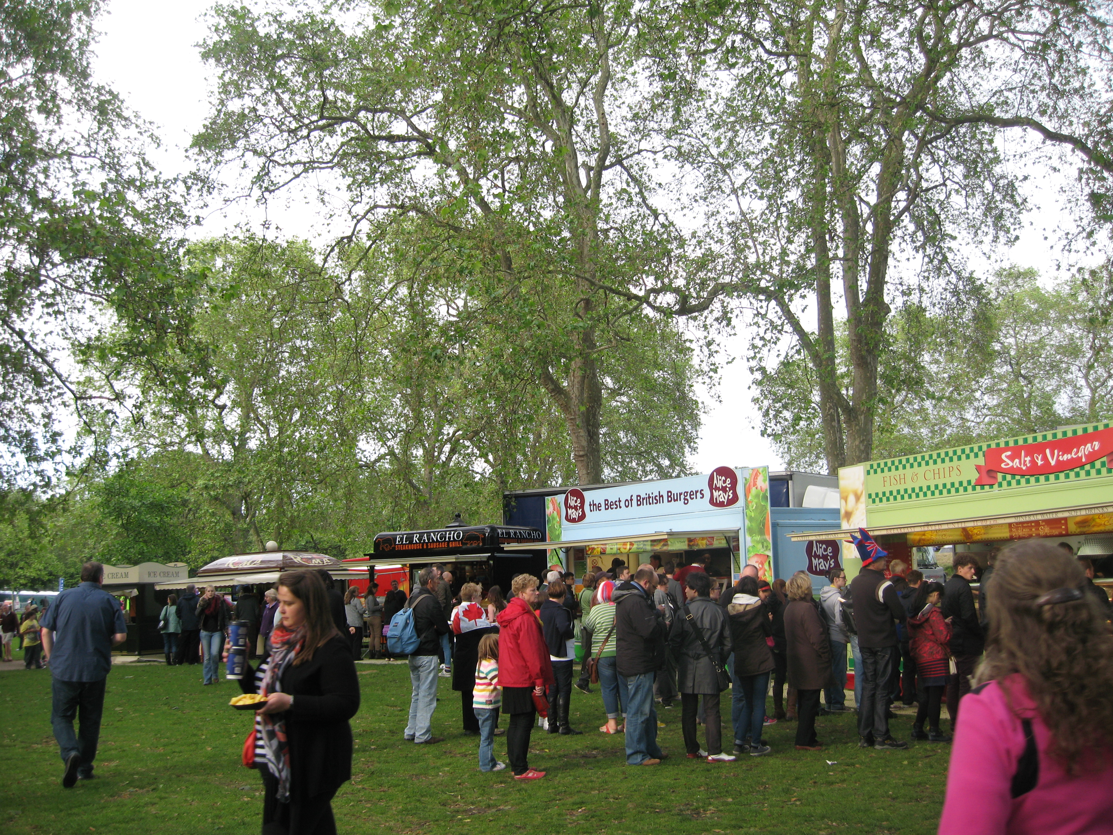 Food stalls were set up everywhere, these two outside Clarence House. This was a mini-Woodstock. Photo by me