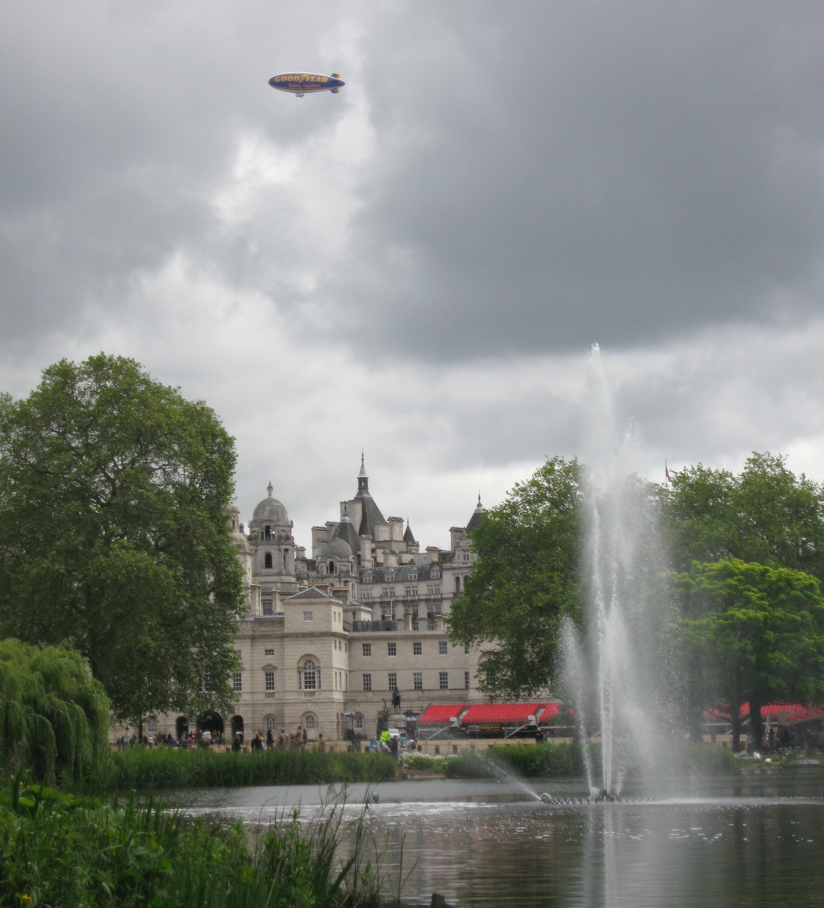 The clouds are building Monday morning as the blimp flies over St James's Park at the Westminster end. Photo by me.