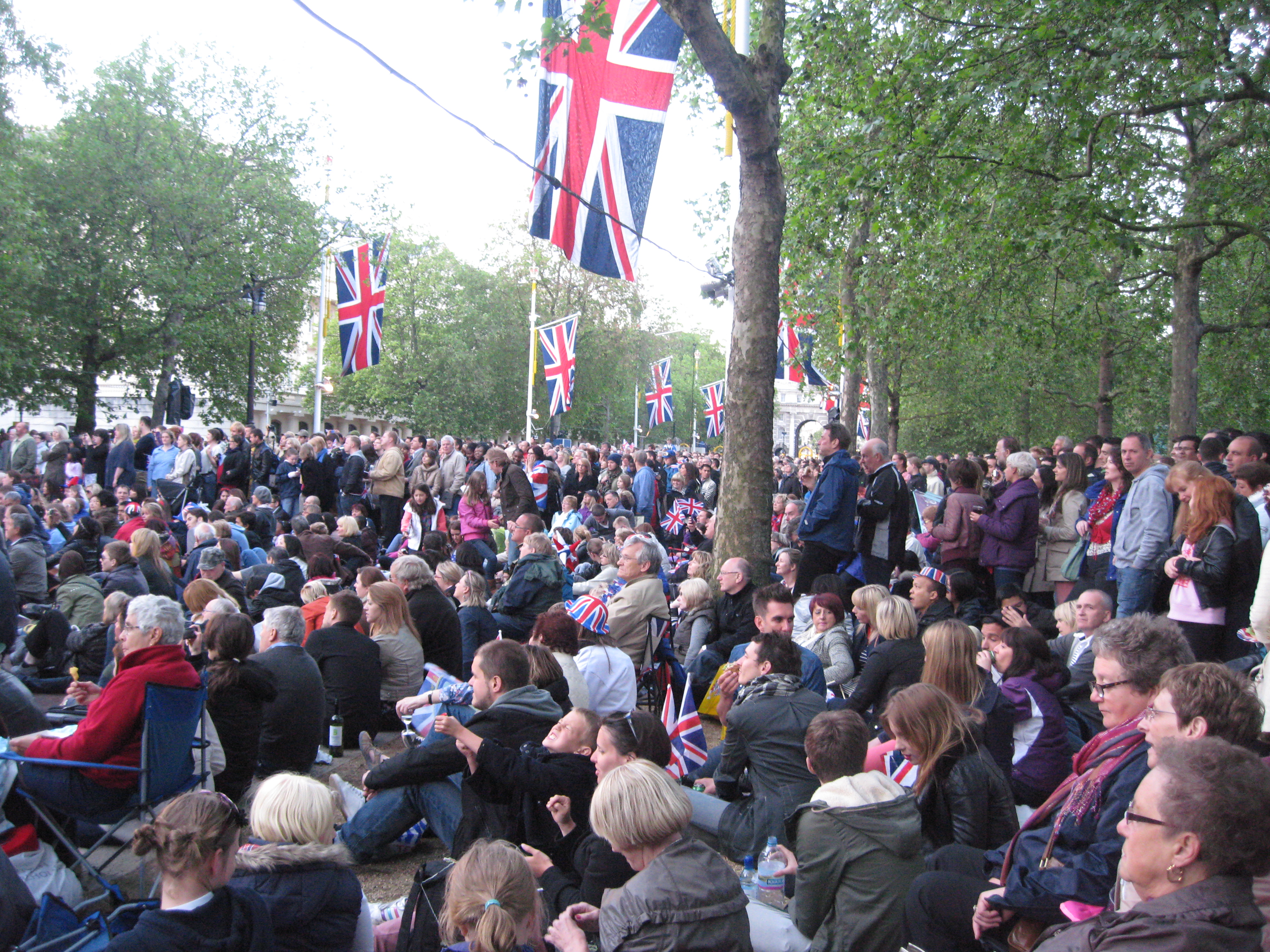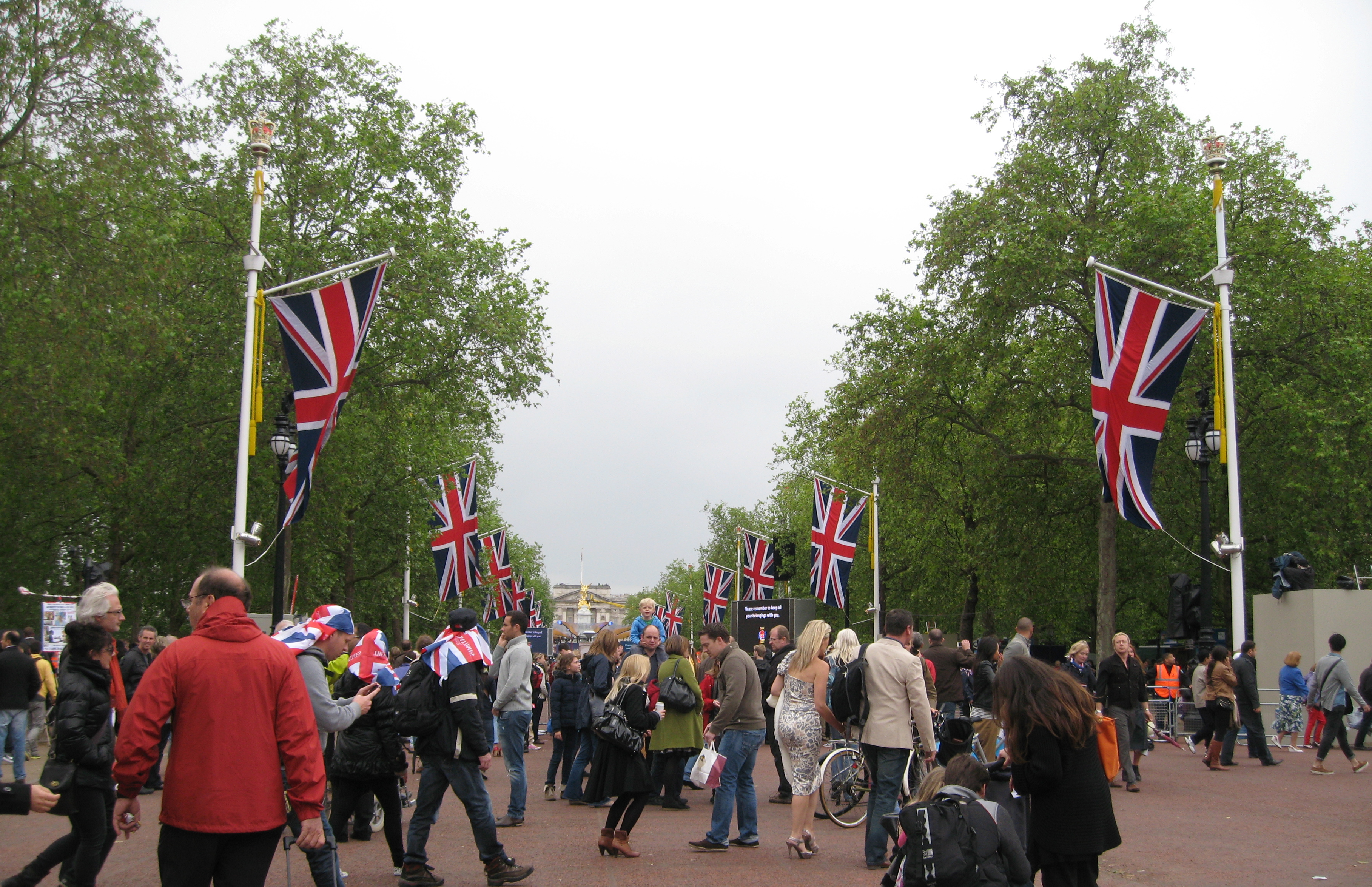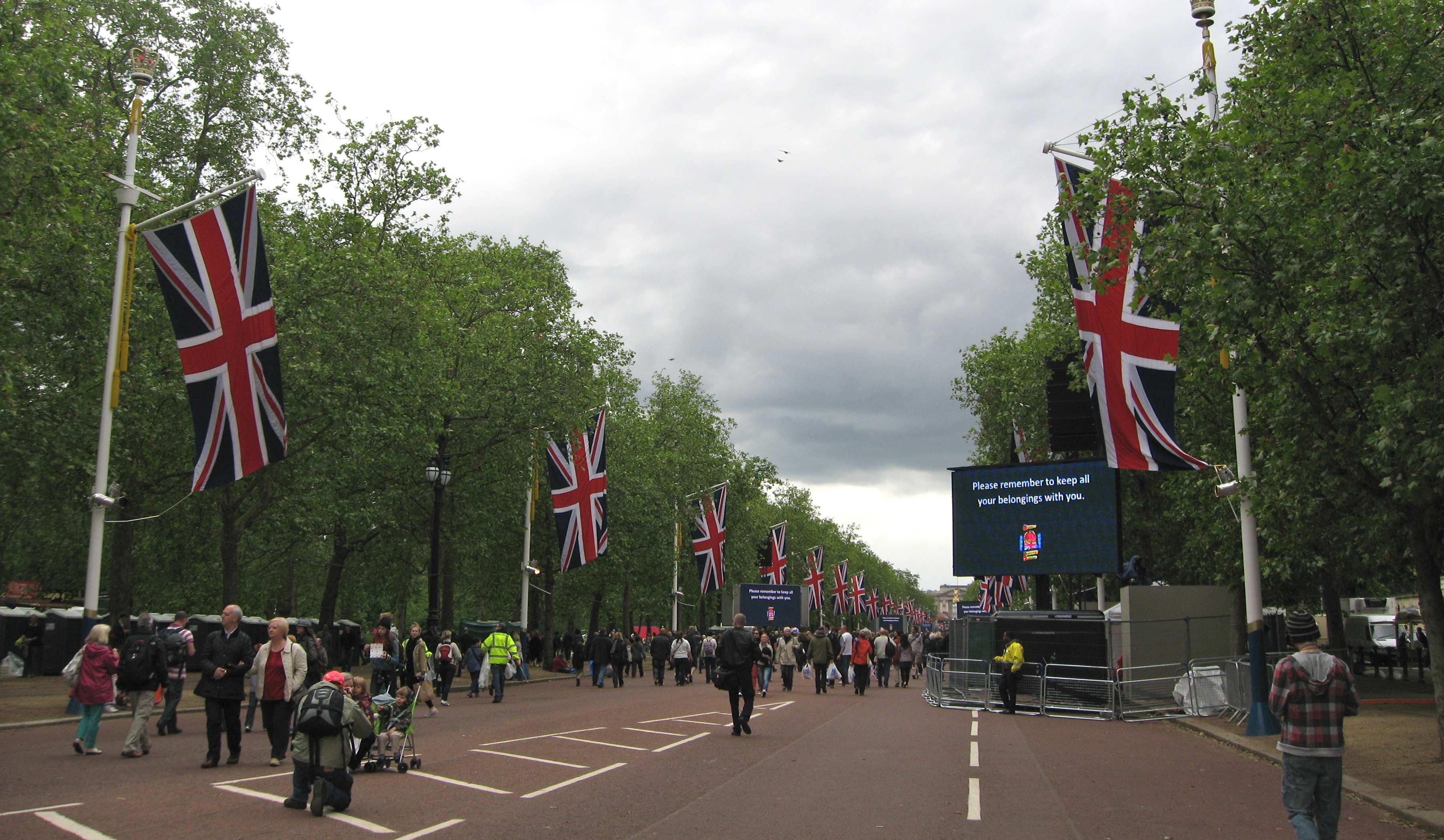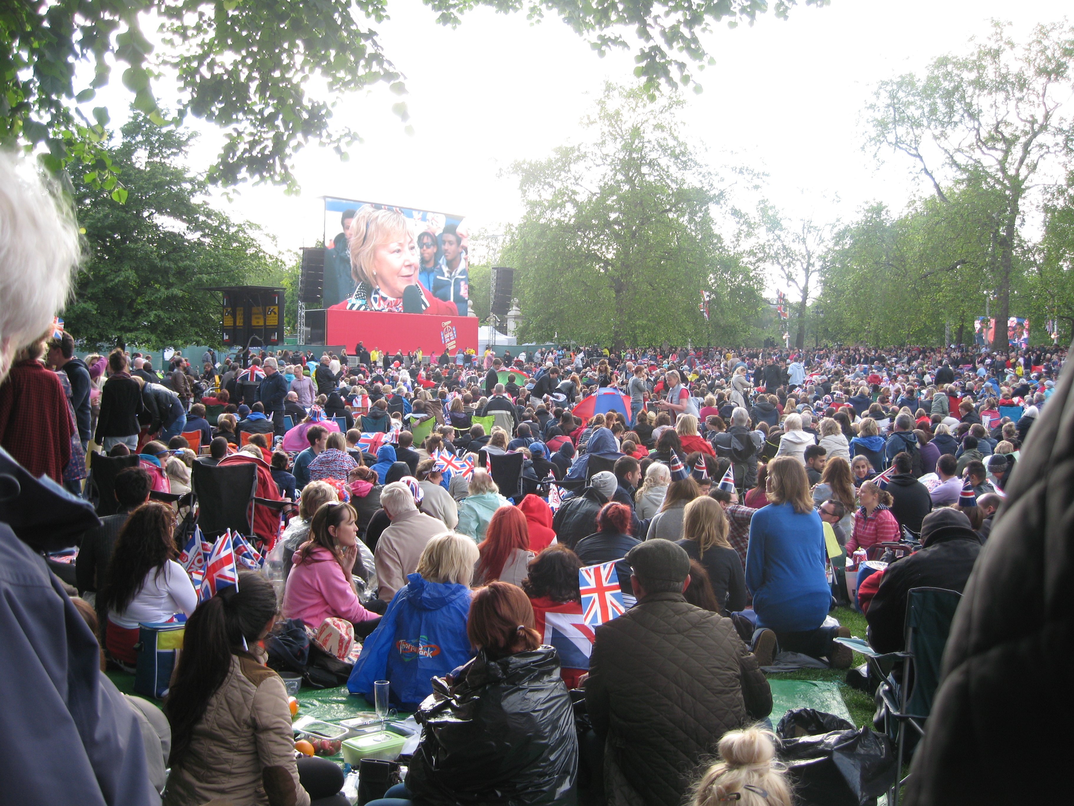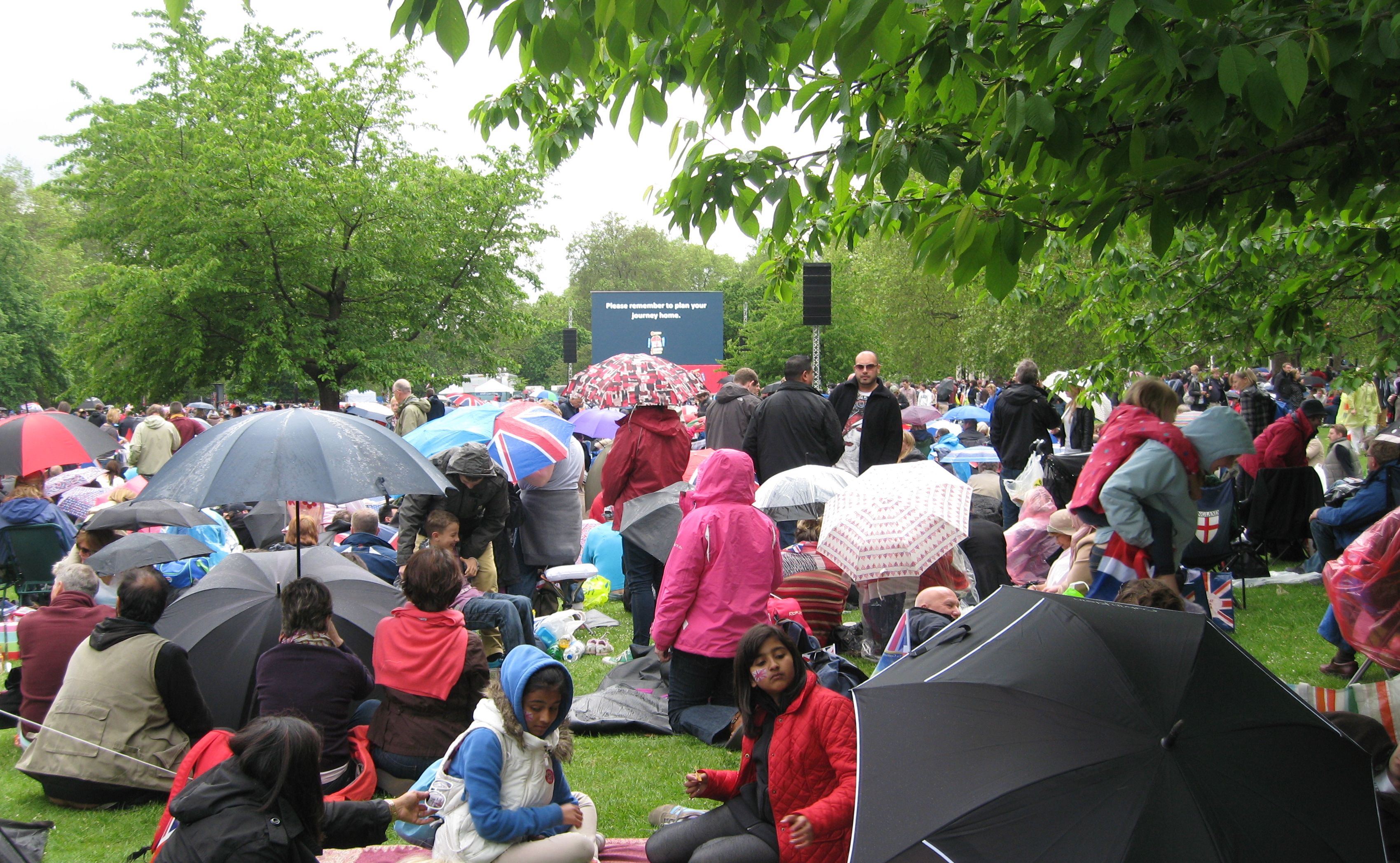 The crowds were already flooding the park before noon staking out their spots with flags and blankets. The 10,000 grandstand tickets had been awarded ages ago by a national ballot. Those lucky sods also got a picnic in the Buckingham Palace Gardens. These additional attendees were people outside the inner fence trying to get a good view of the big screens set up down the Mall and in St. James’s Park.