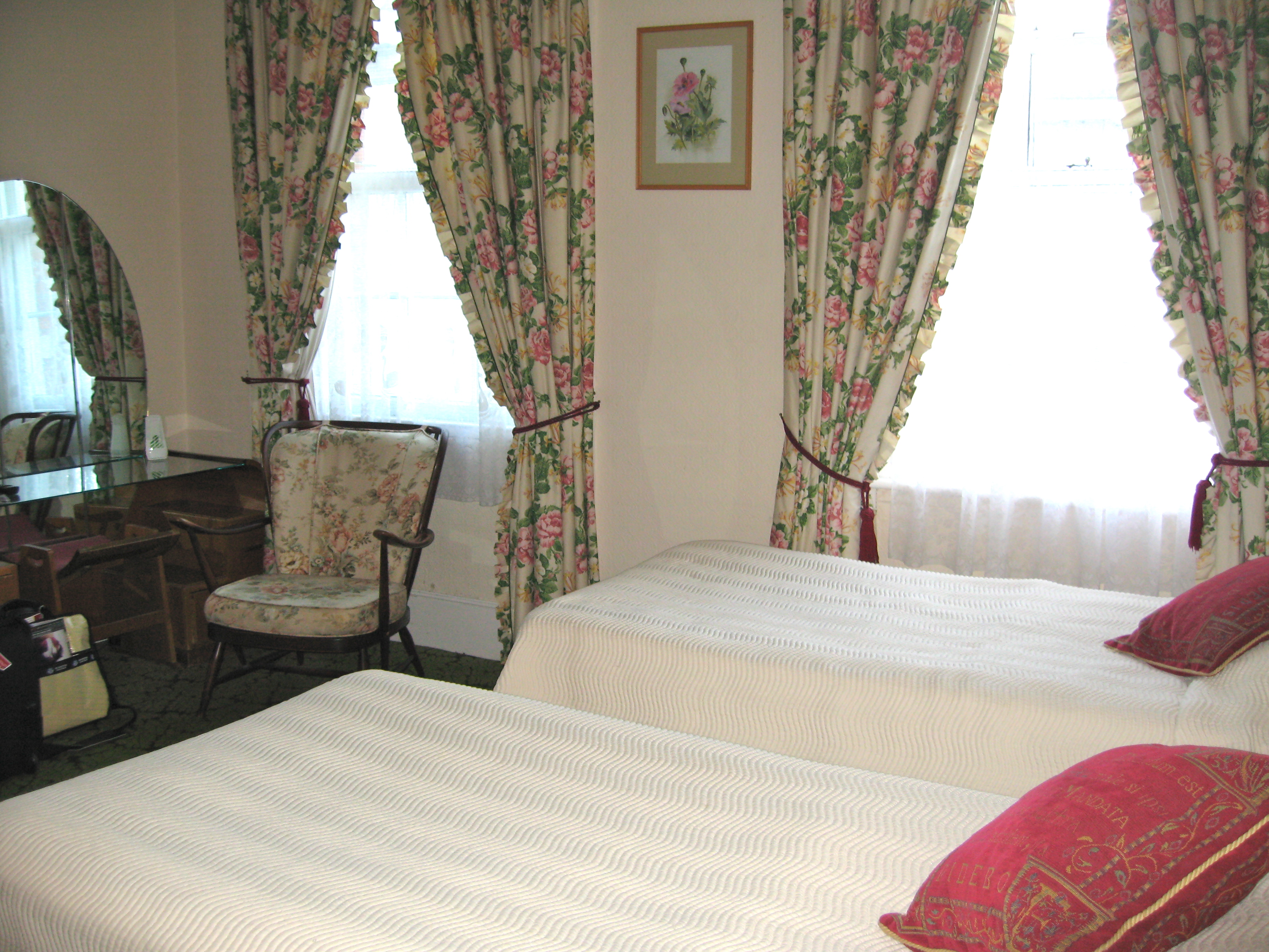 On our trip this year we were able to reserve our favorite room, #6, and were pleased to find that it had been newly refreshed with classic floral drapes, and new carpet. The room is on the back of the inn facing towards the high street rather than the seafront, but it is roomy and can accommodate our massive amount of luggage–and it is only one flight of steps up from the parking area, so easier to haul the luggage to the room.
