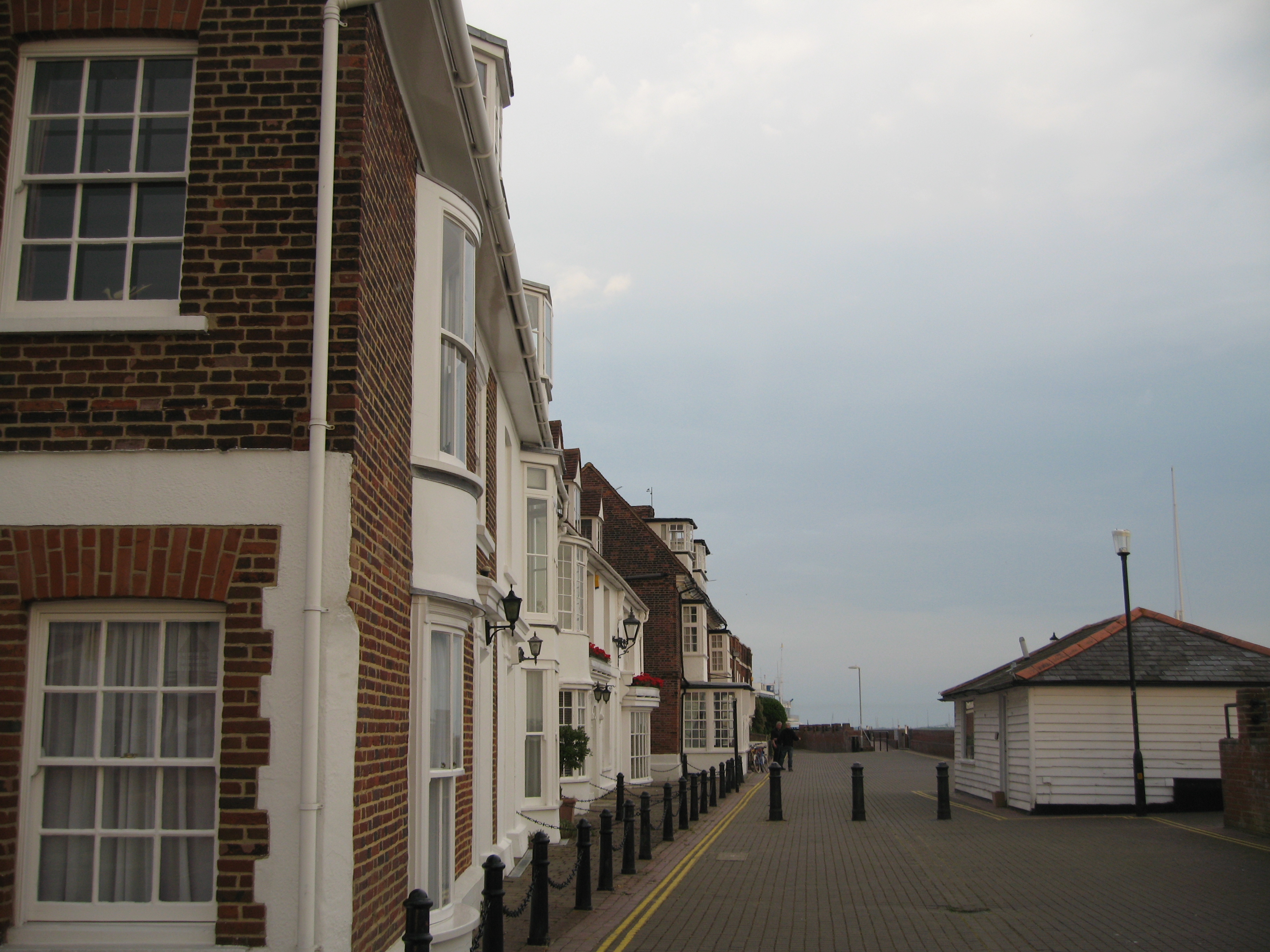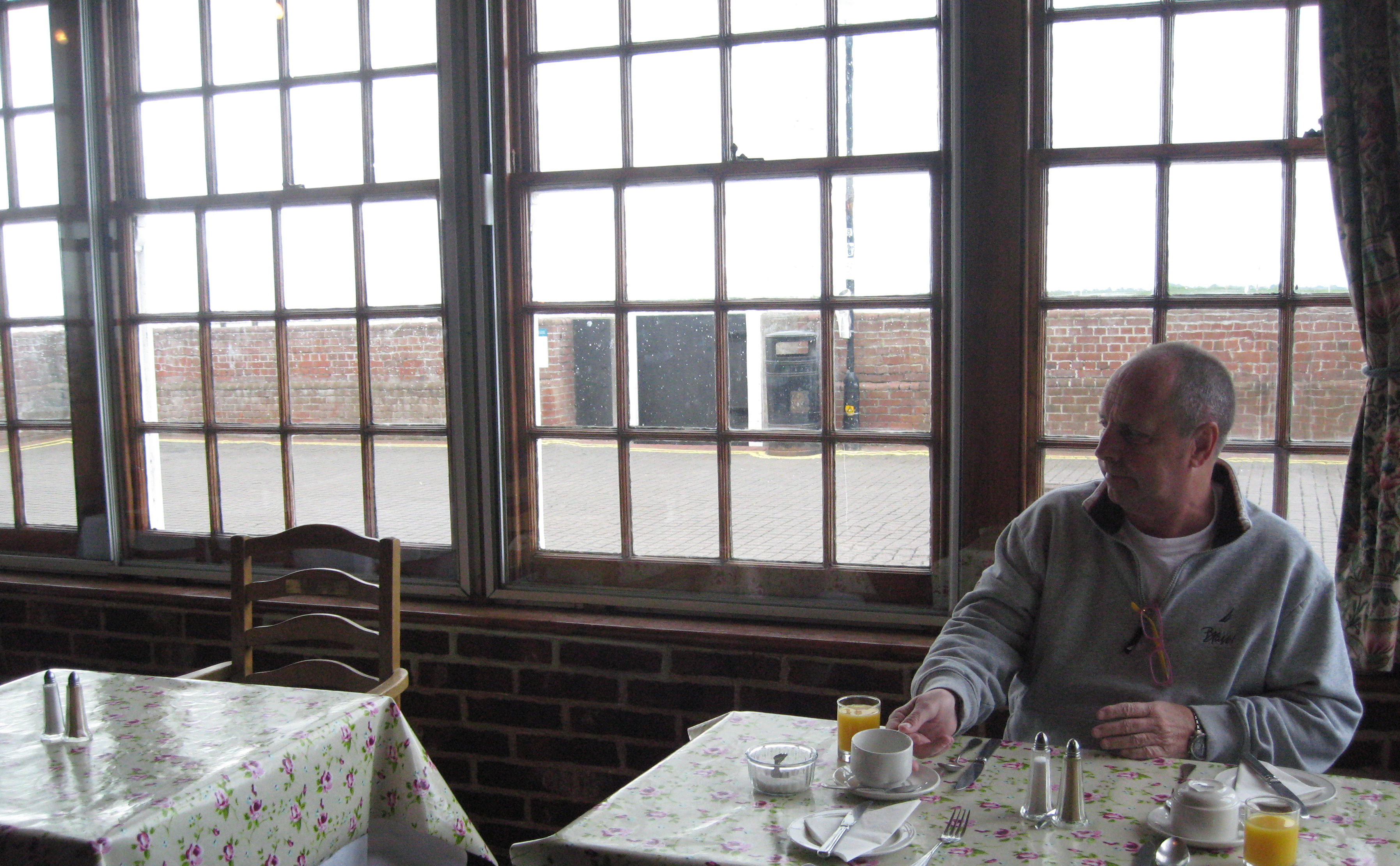 My Beloved Brit managed to get a full English breakfast with sausage and bacon, almost every morning. I loved watching early morning walkers along the sea wall. Photo by me.