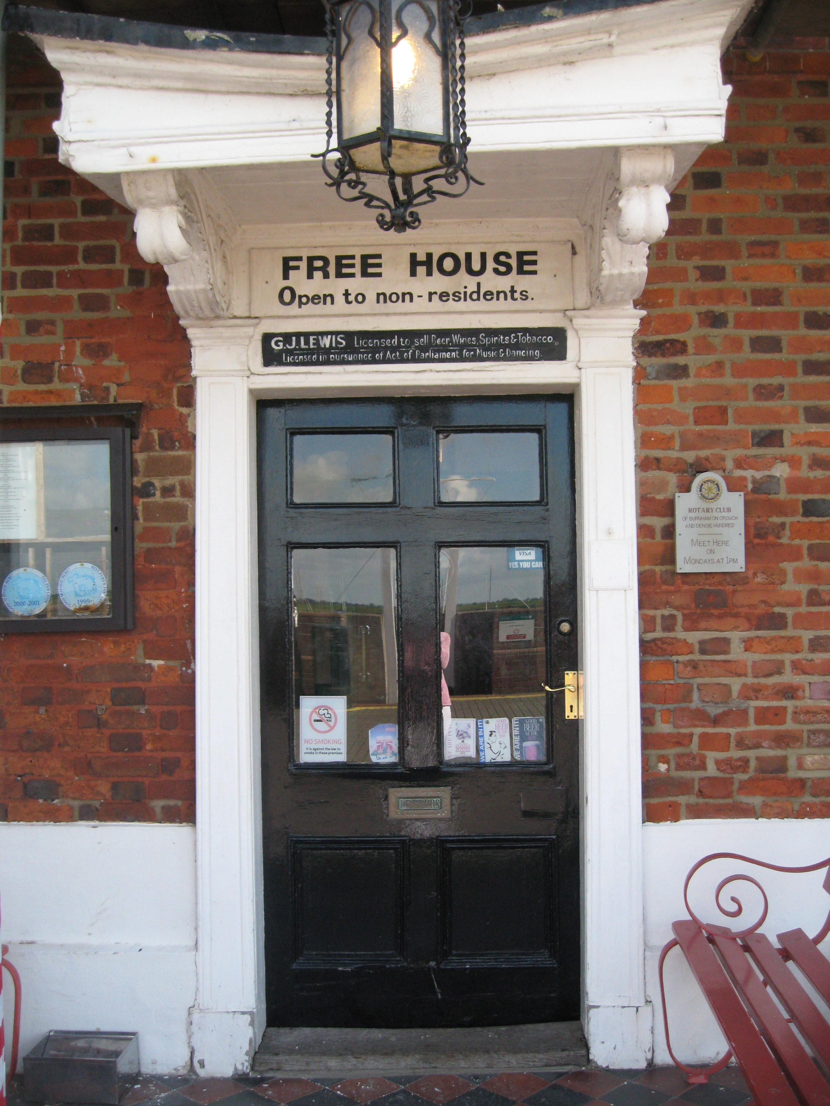 The front door of The White Harte, “G. J.Lewis, licensed to sell Beer, Wines, Spirits & Tobacco. Licensed in pursuance of Act of Parliament for Music & Dancing.” Photo by me