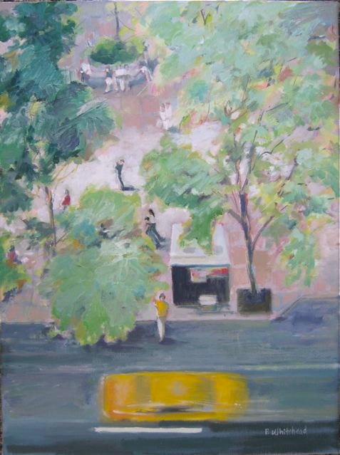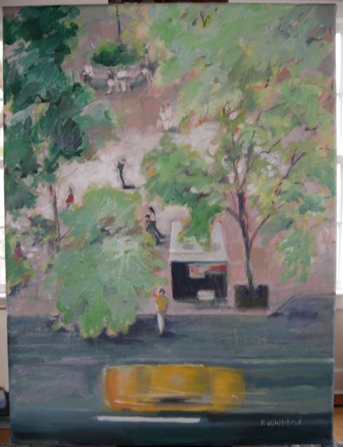 I have many images of Central Park that I have been looking at and sketching as part of the “Cities” series of paintings I have been working on this year. One of the things I have noticed working on this series is how similar the great parks are.  Although each region has its own personality, the parks also have common elements–the broad walking paths, gorgeous ancient trees, people playing games…socializing…walking, and cool swaths of rolling lawn.  And of course a water feature.