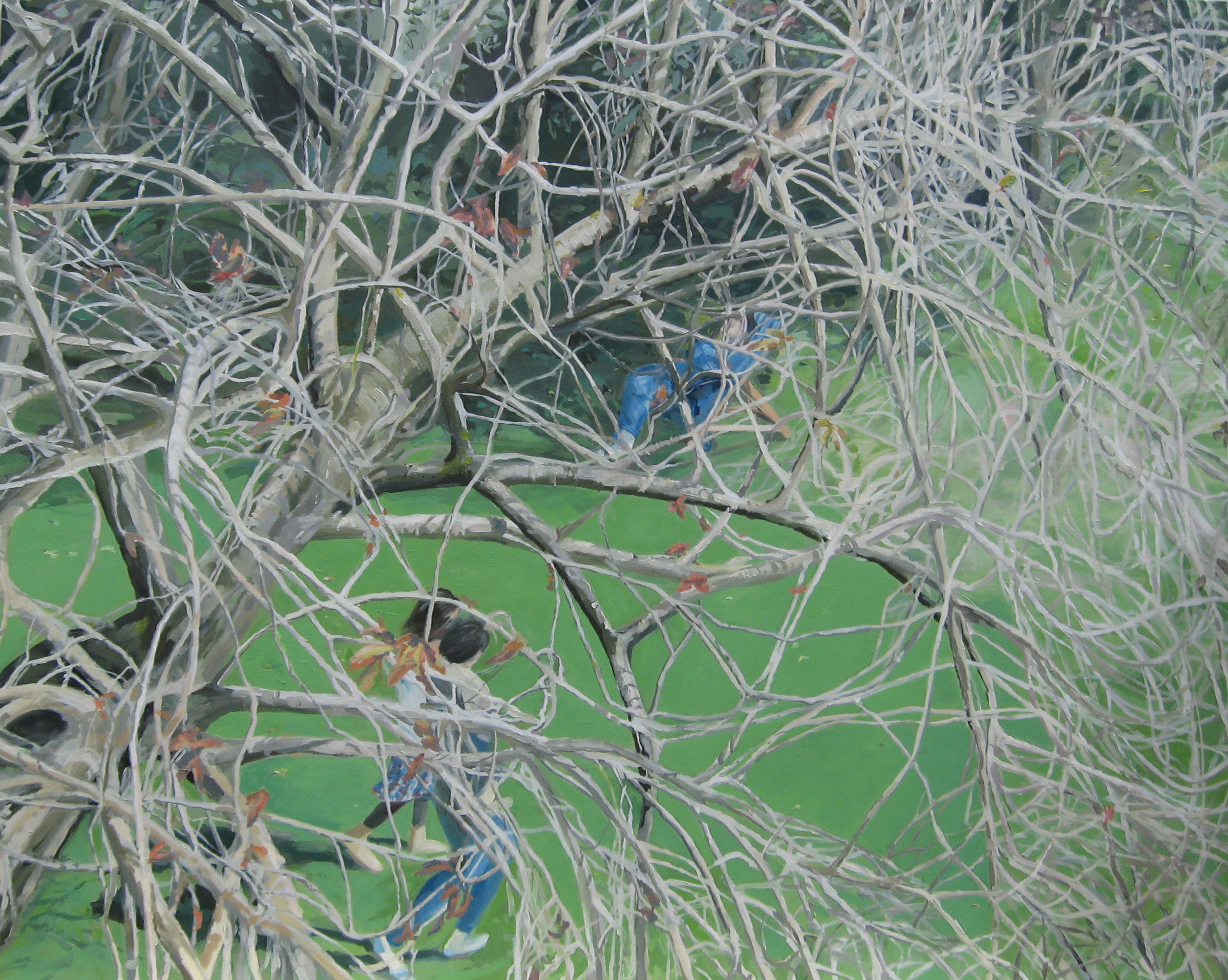 So when I started to paint the scene, I wanted the trees to become almost a halo around the three figures, setting them apart from the world around them. And I cropped it so that the women were the center of our attention.