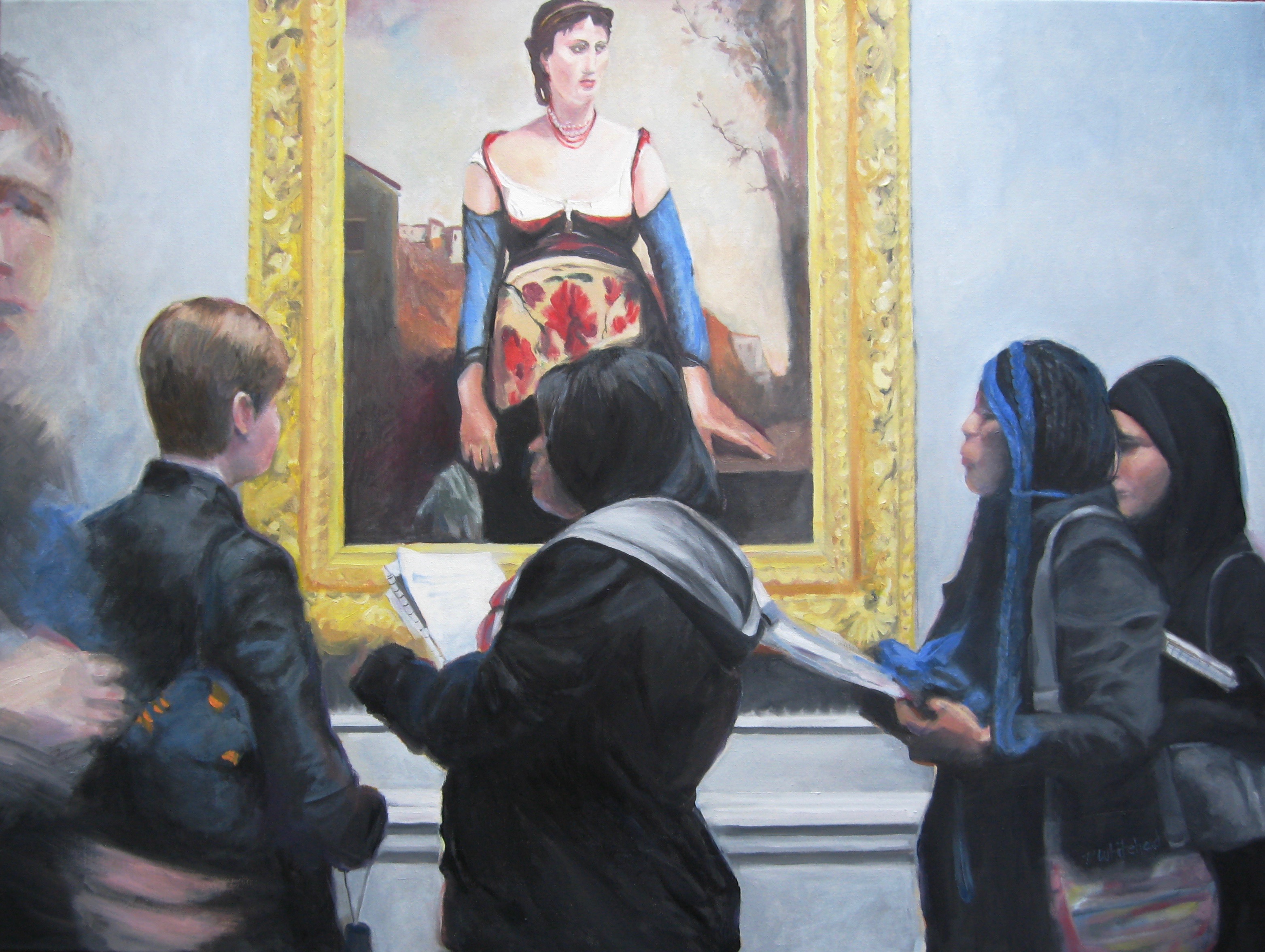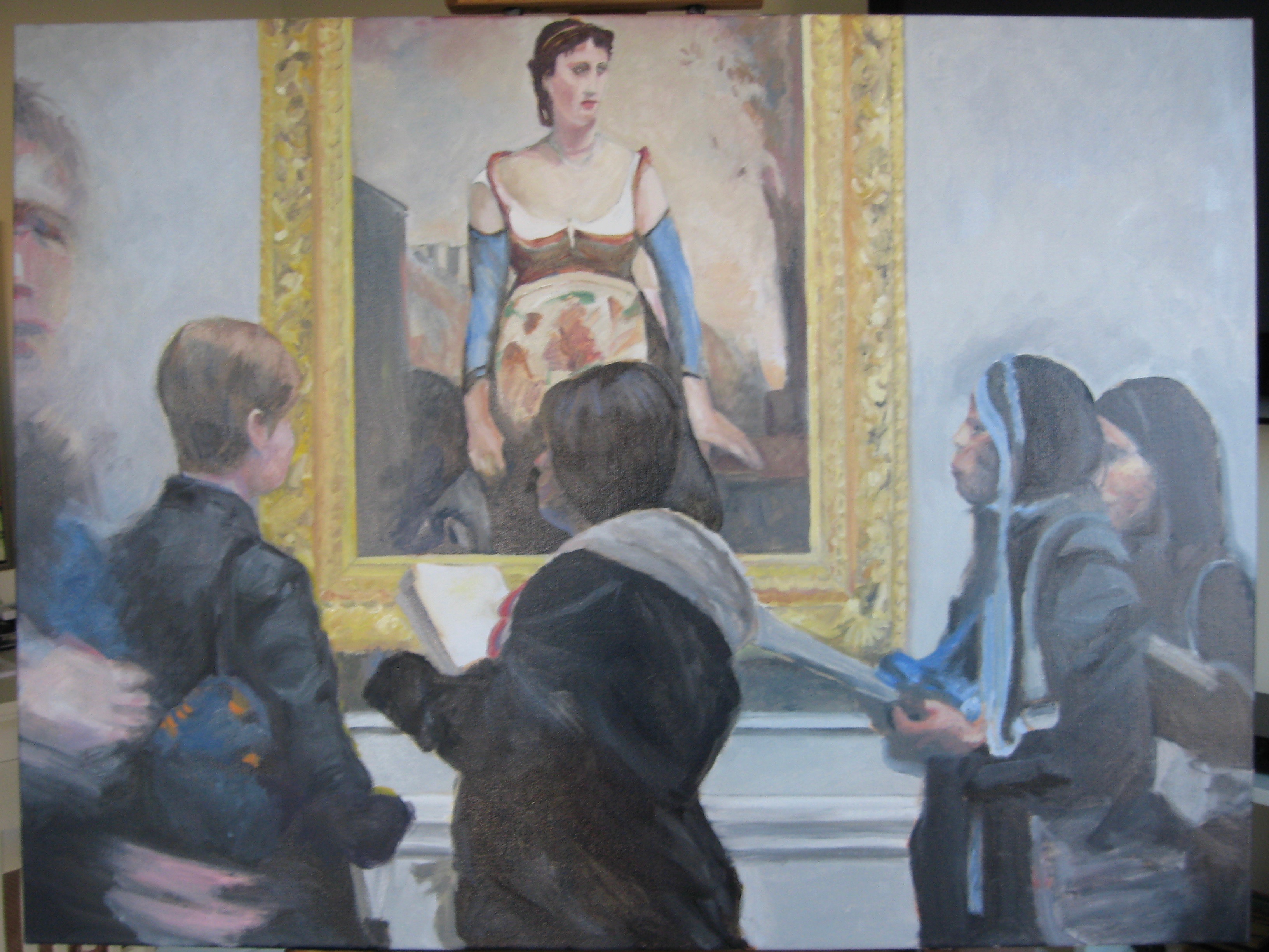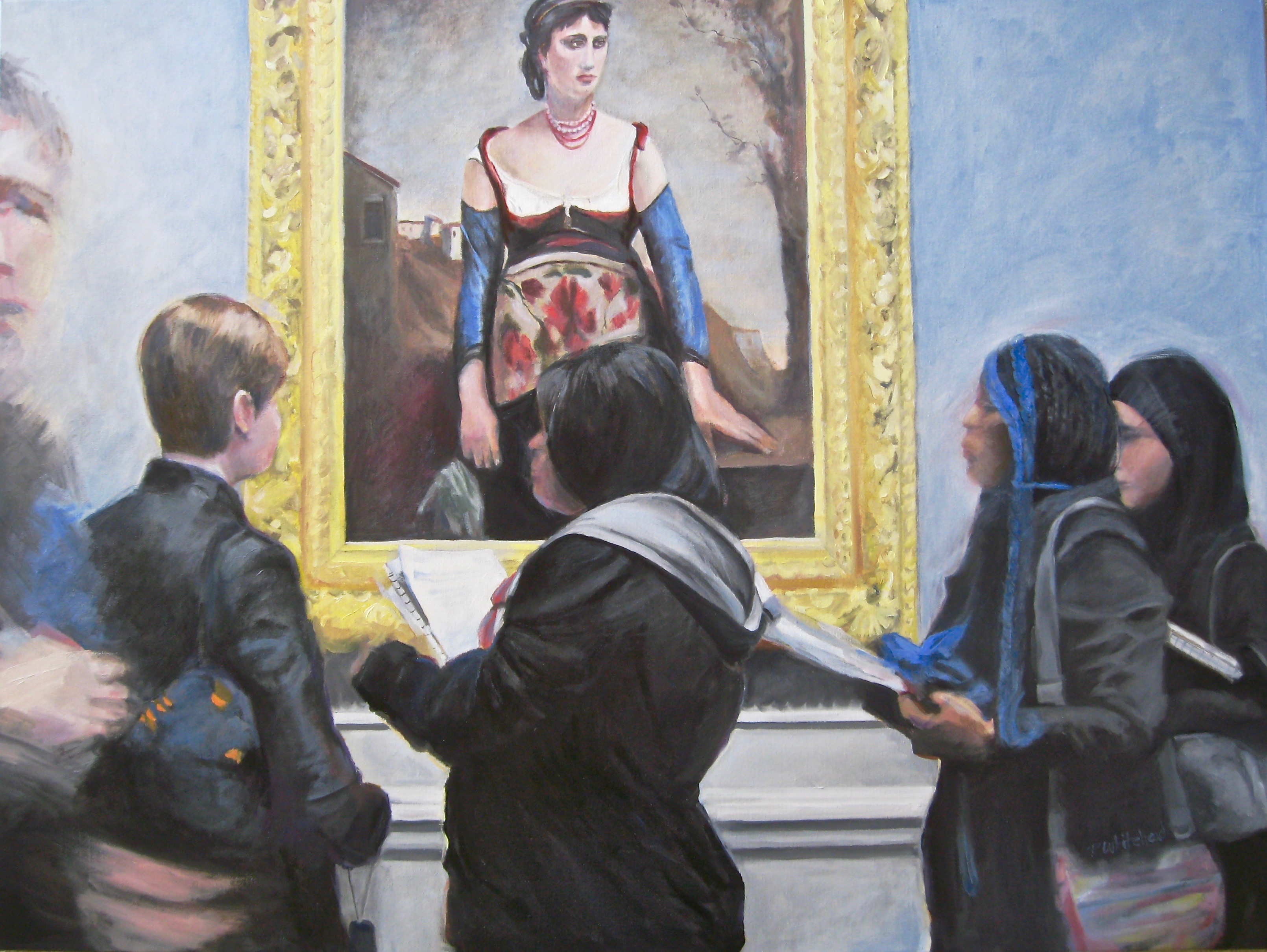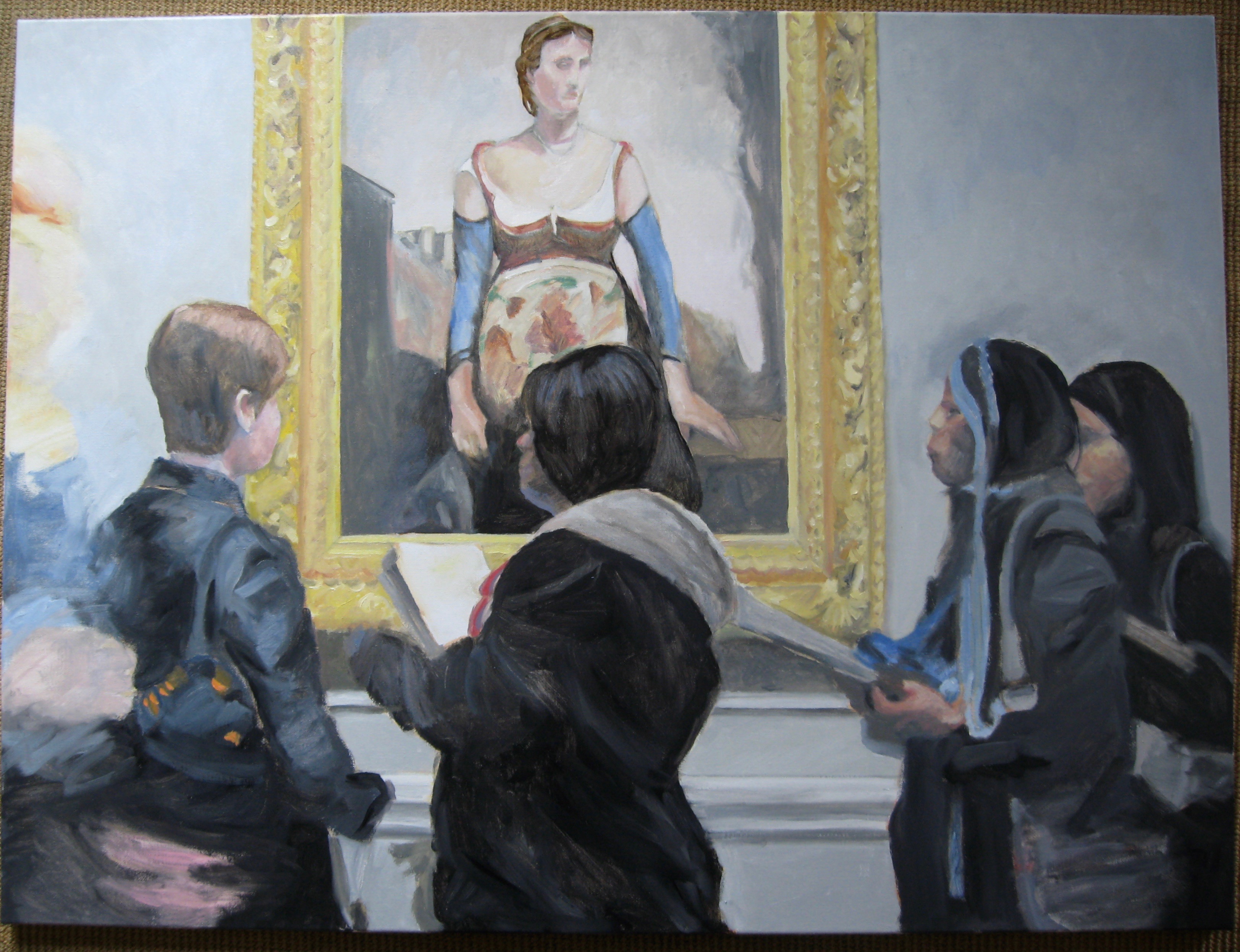 I went back home and reminded myself of what I saw. Four women were deeply involved in the painting, notebooks in hand. But they weren’t writing they were looking and thinking…not a cell phone in site. I love these women.