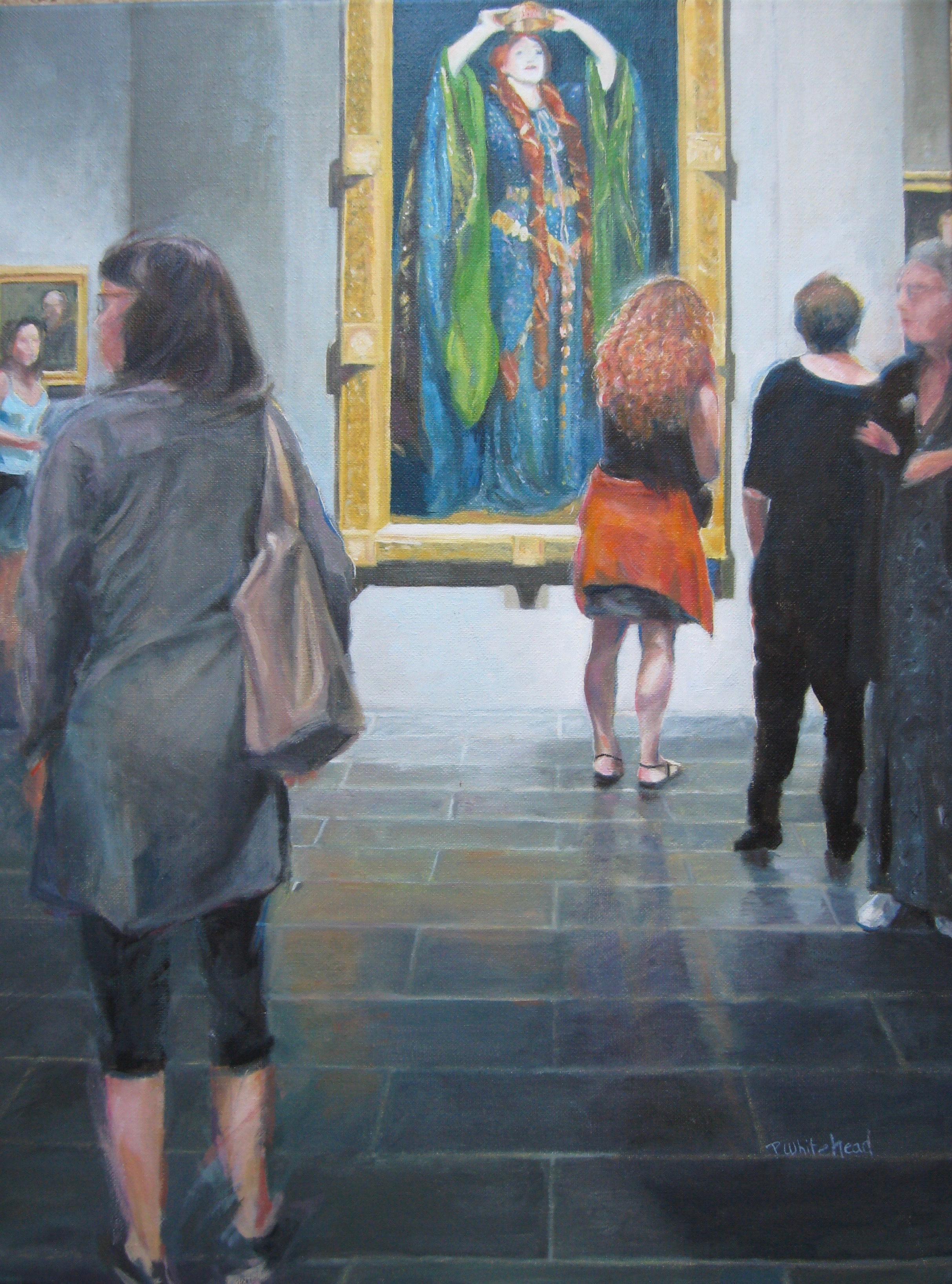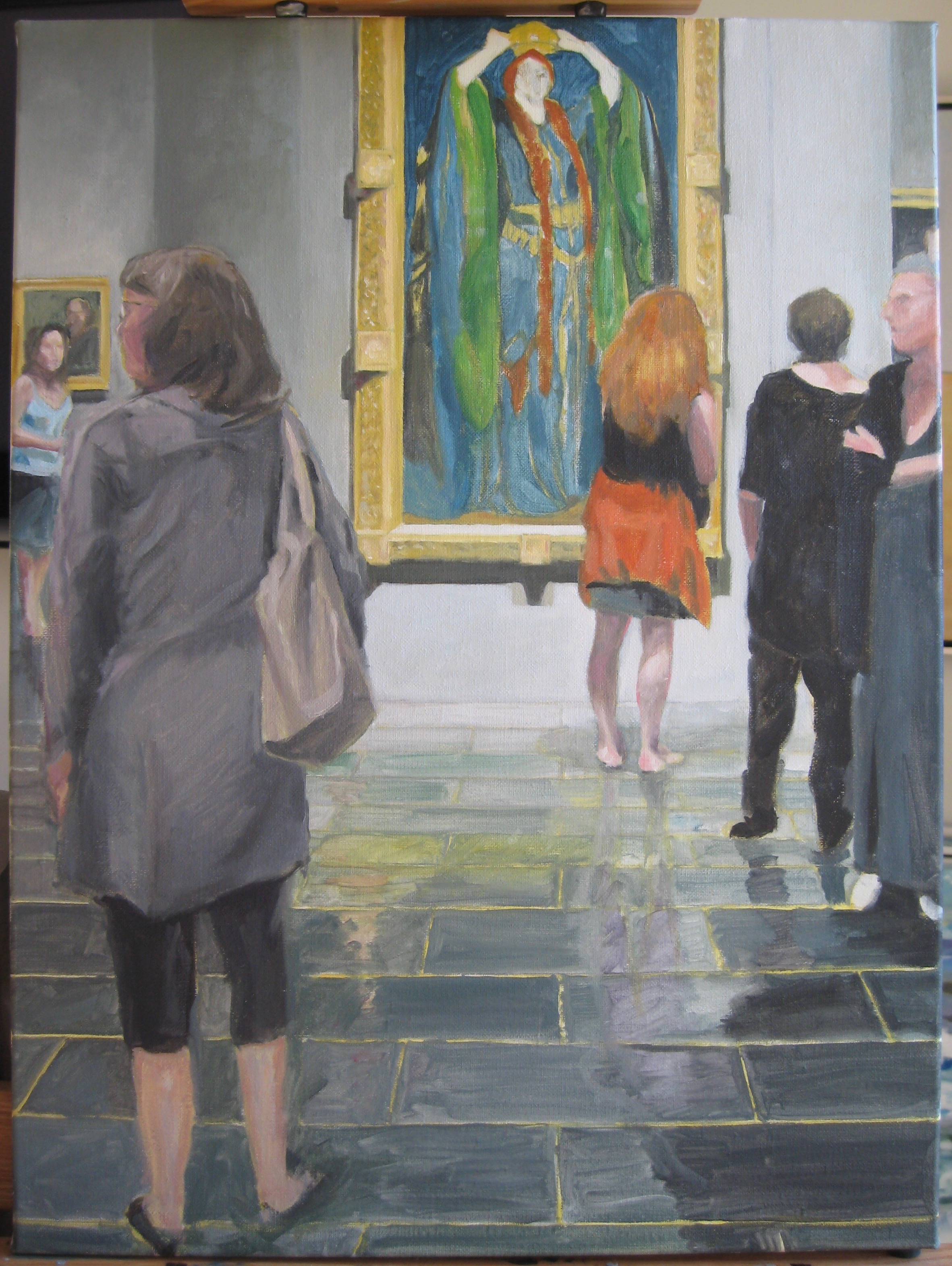 I darkened the skirt of the woman in the background on the right, moved figures in the initial sketches to create the dramatic “V” from the foreground to the painting and the red-haired girl. After days of working on Lady Macbeth’s robes with translucent layers of thinned paint, I then worked on connecting the painting to the viewers with the reflections on the floor.