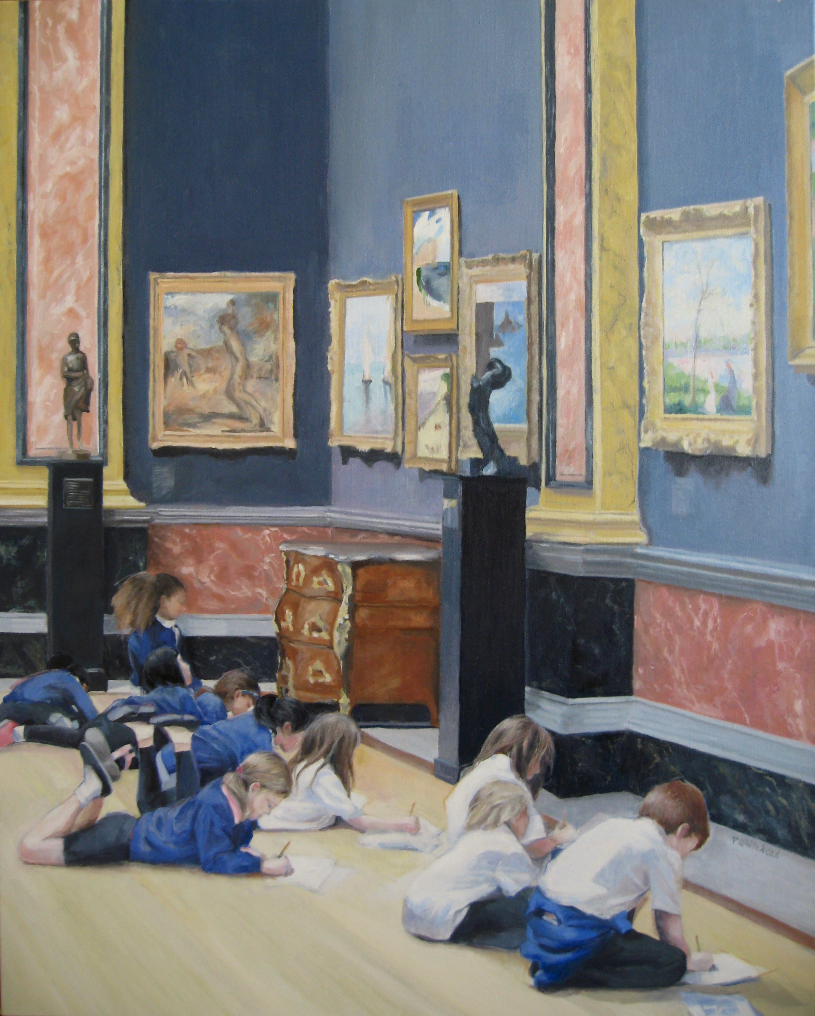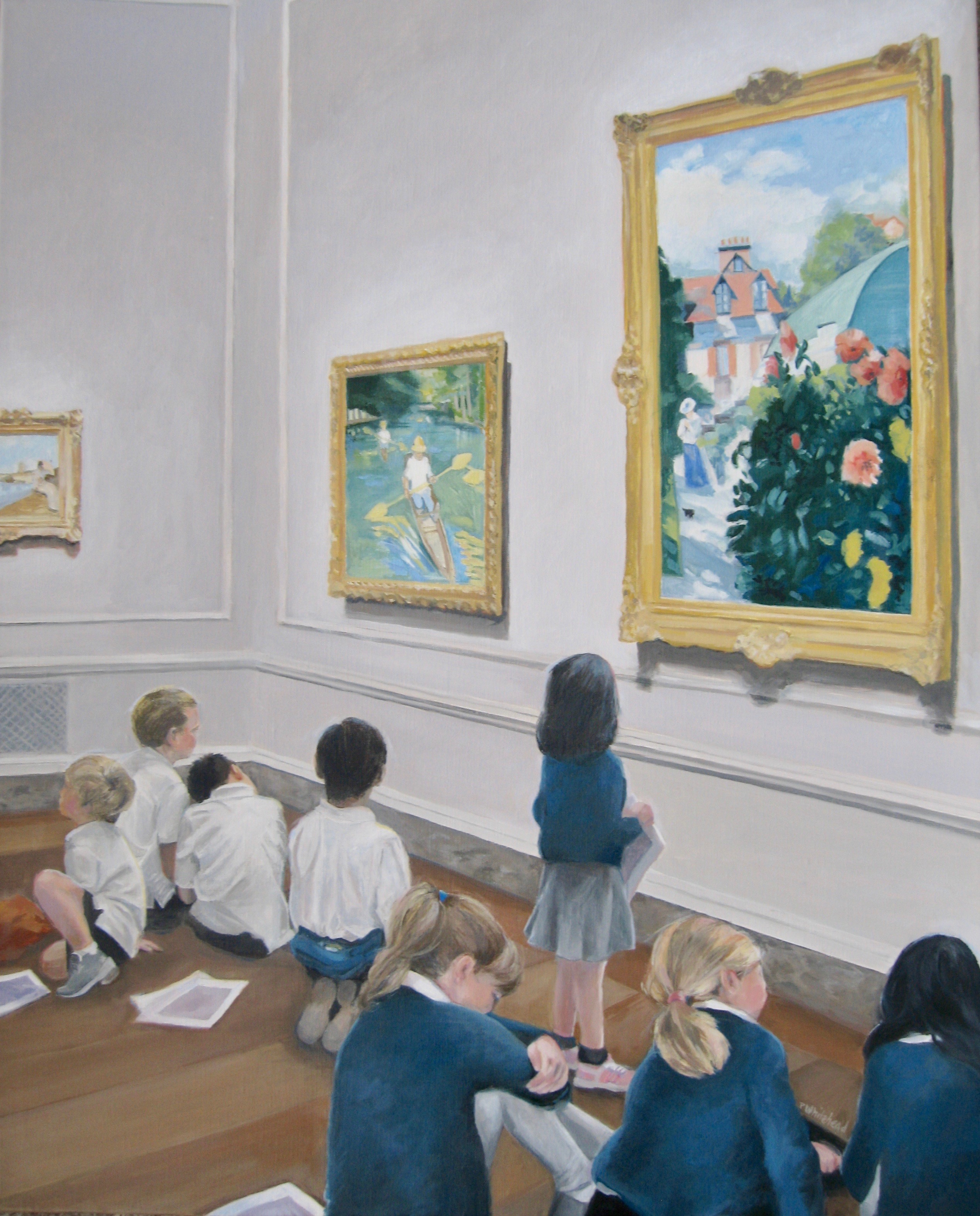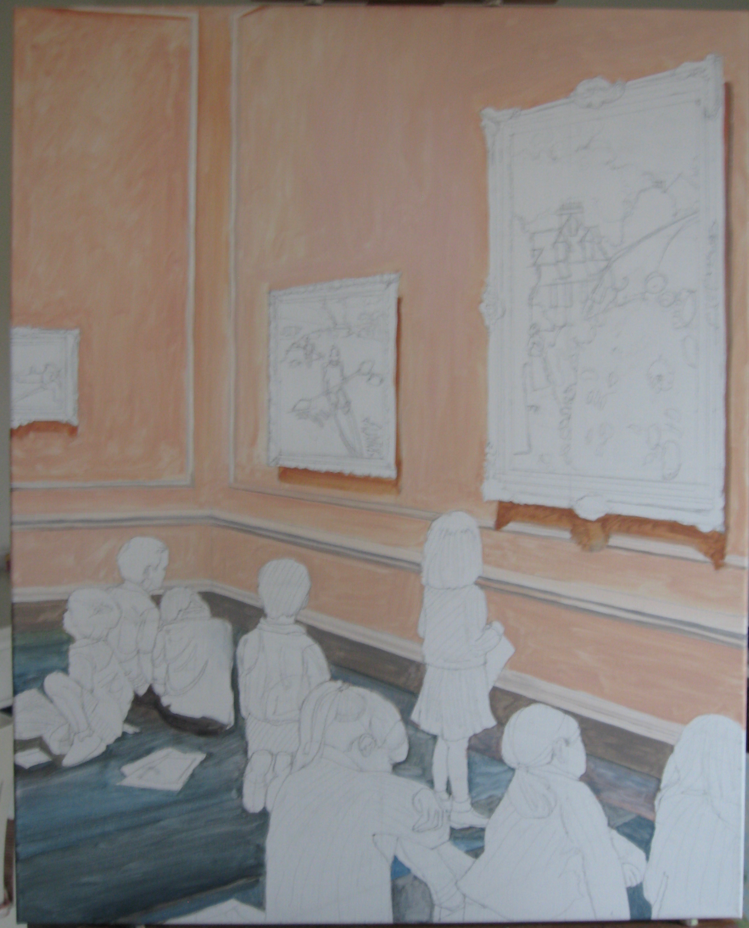 I chose The National Gallery of Art this time, in Washington DC. I never have a total preconception  of what I will paint.  I always figure I’ll know it when I see it.  I knew I wanted young children in school uniforms visiting a museum. I found lots of school groups.  But not the age I wanted. So I kept looking.