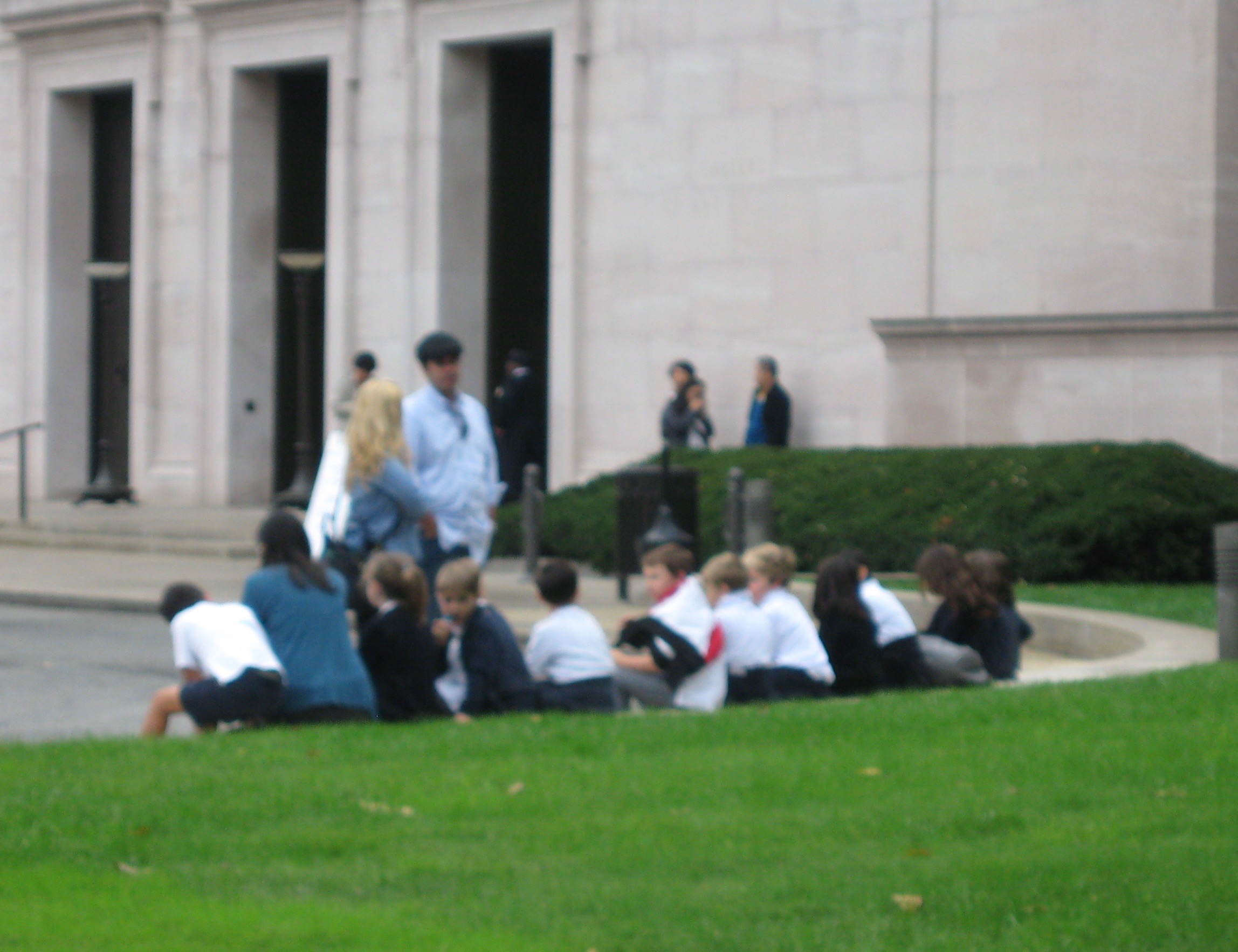 When I walked up to the museum on an early weekday morning reconnaissance mission, I was pleased to see a group of children, in uniforms, sitting on the curb outside the museum.  I had my potential reference, at least for poses and styling details.