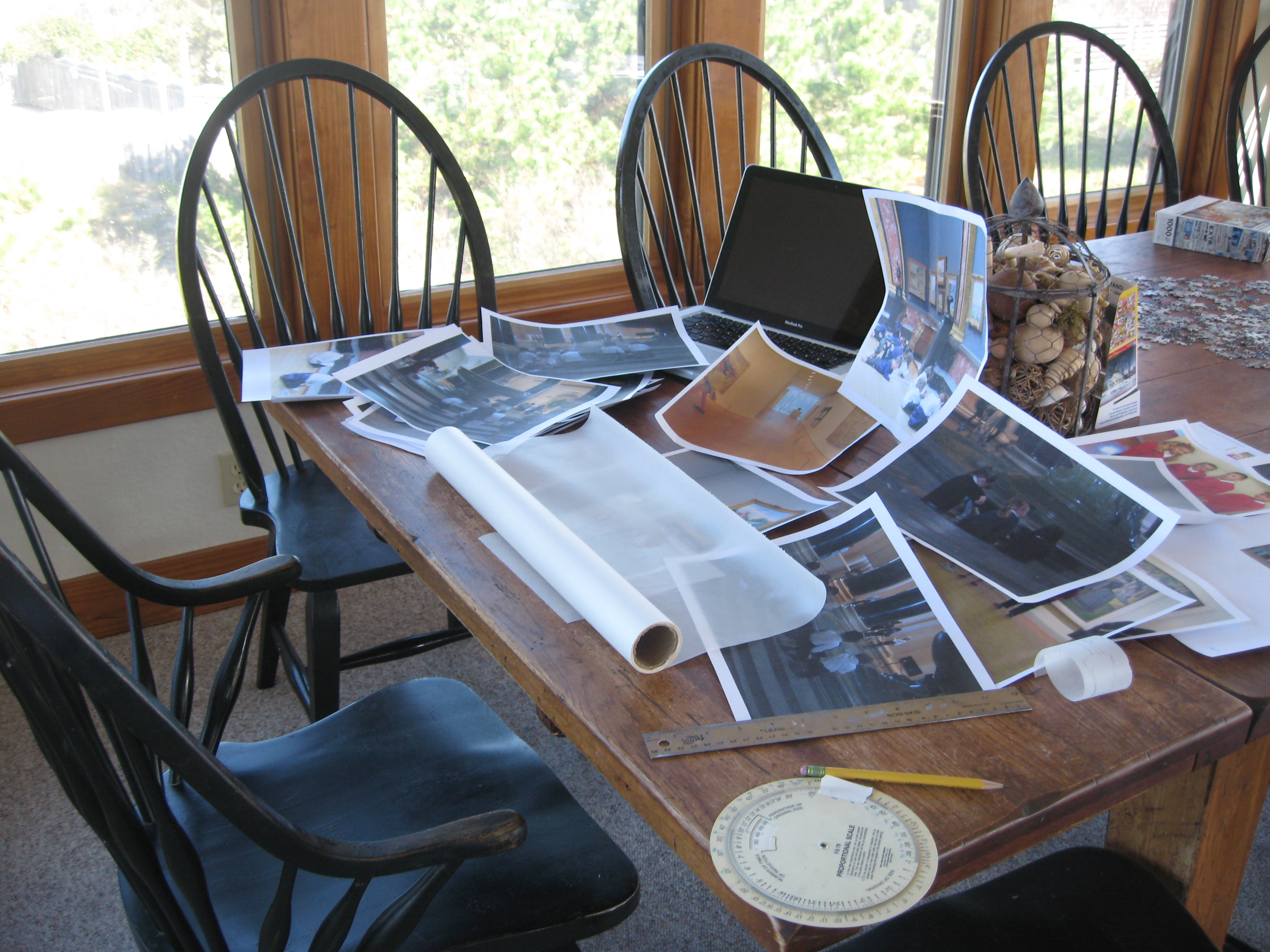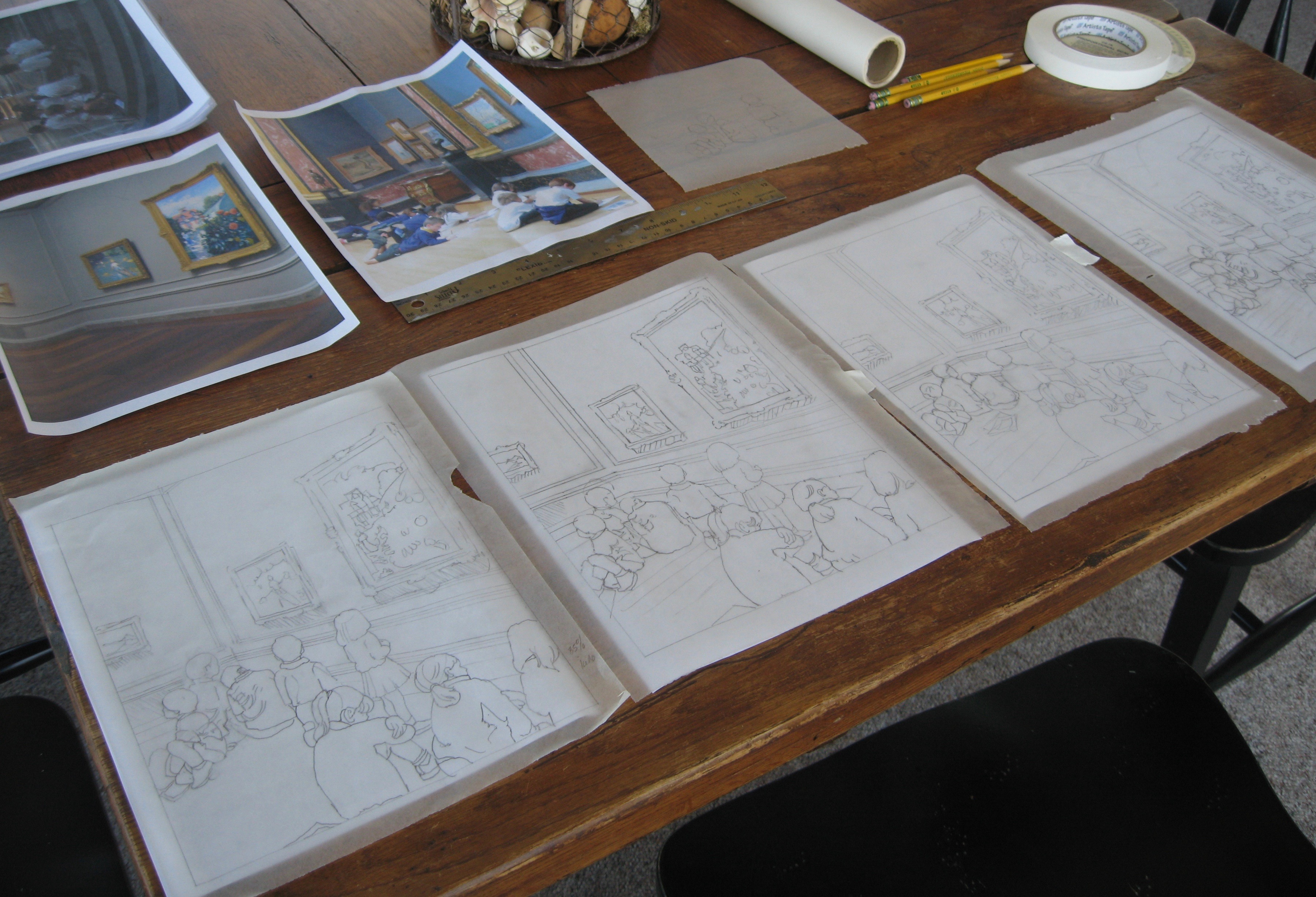 I went home to sketch and realized I still wasn’t sure  about proportions in the space.  So back to the Museum for an hour or two of watching children come in and out of the room to determine height and proportion in relationship to the art and room. Perspective was tough.