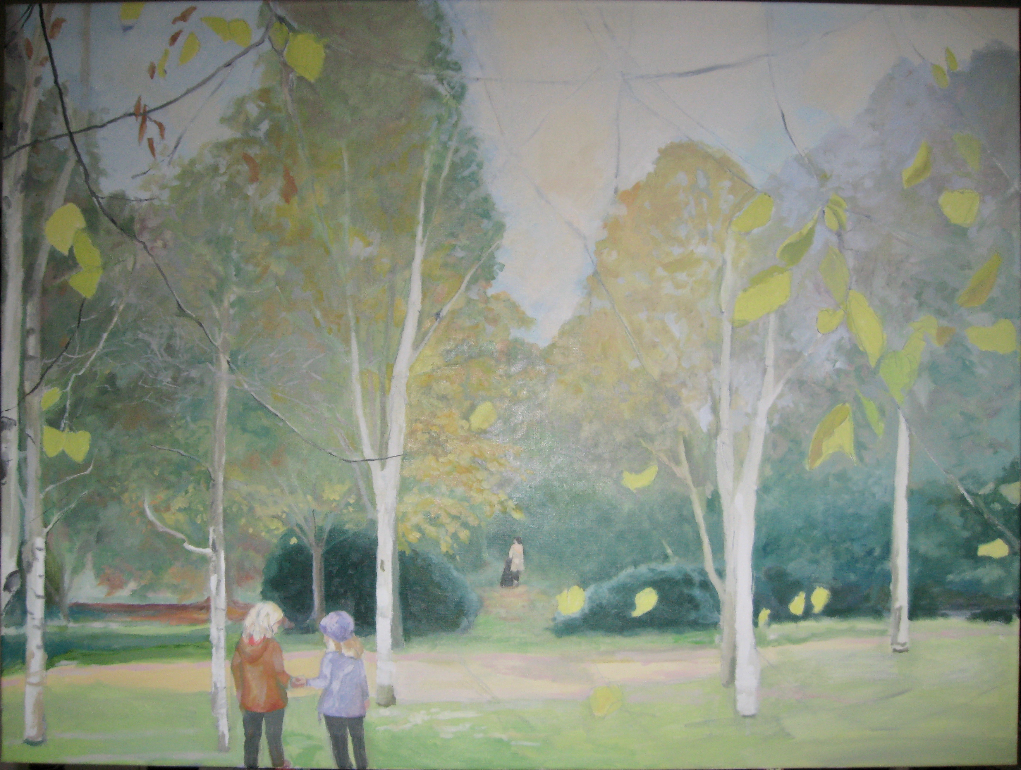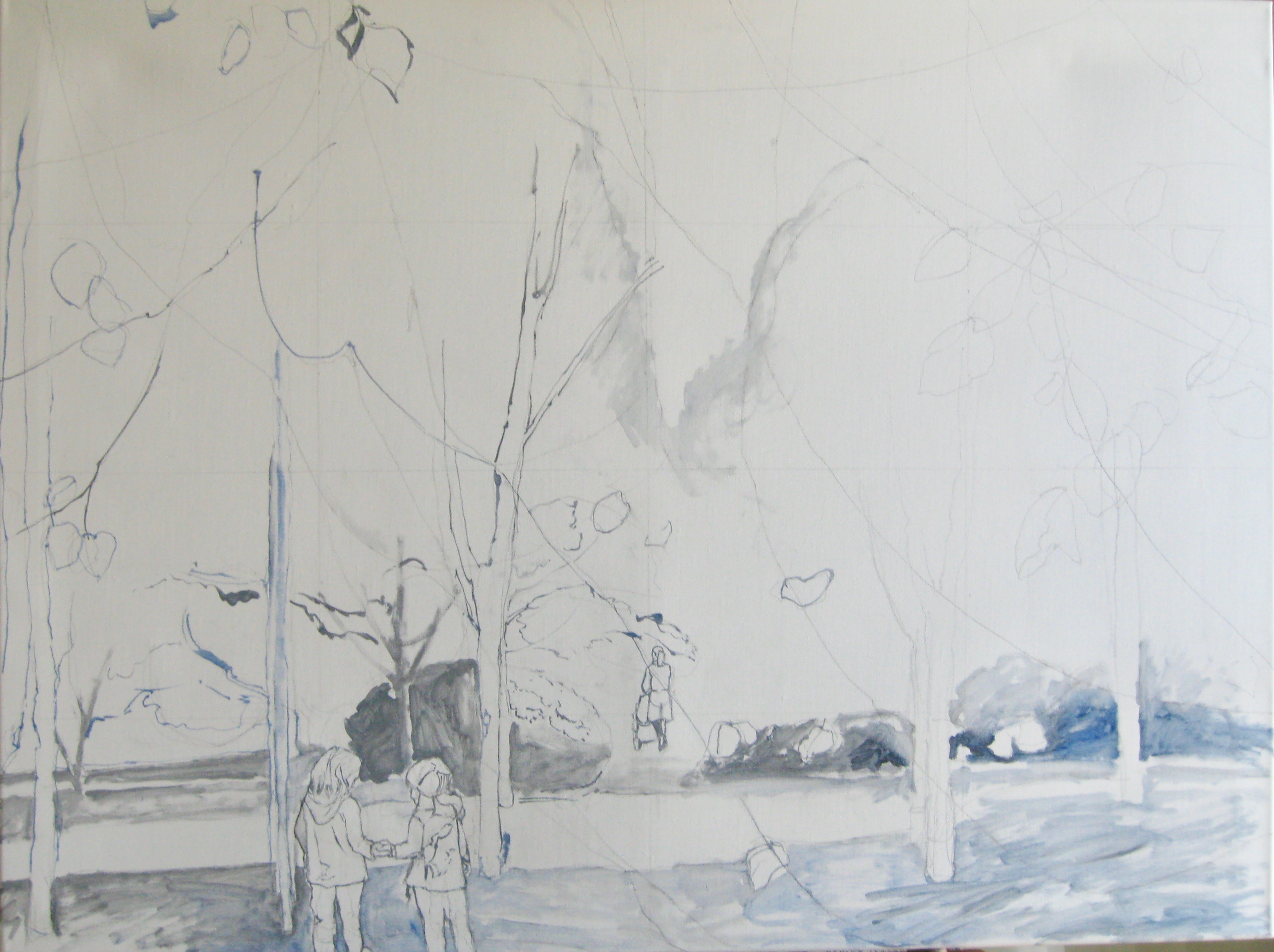 I added the traveler peering over the wall, decided to decrease the size of lamp and have the edge of the wall in the foreground disappear a bit into the rich grass.