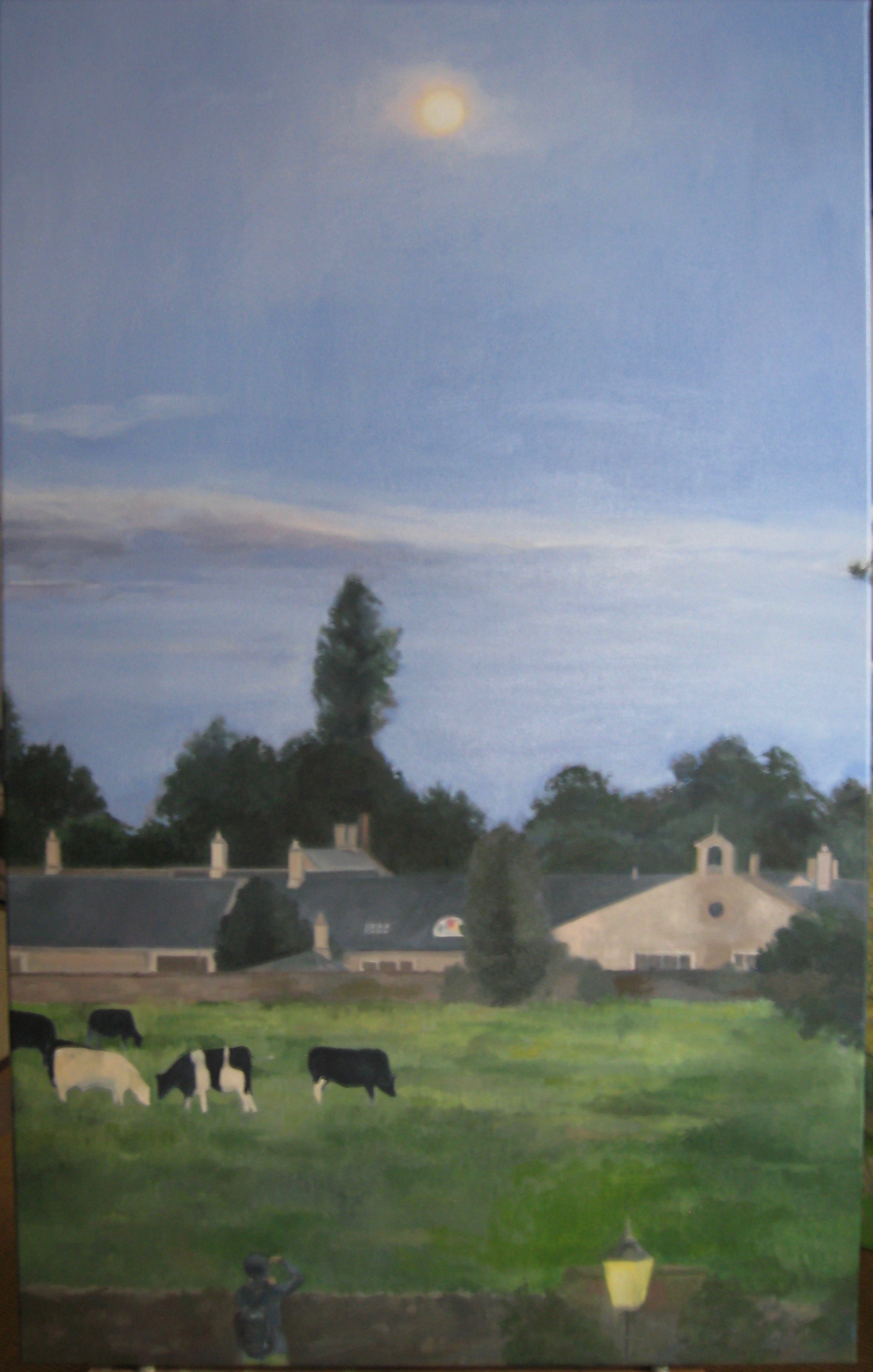 I refined the sky with the ever-present British clouds skirting the horizon, and added details to the incredible farm buildings in the distance. I watched this scene from my window until just the moon lit the sky. The cows didn’t stray far.