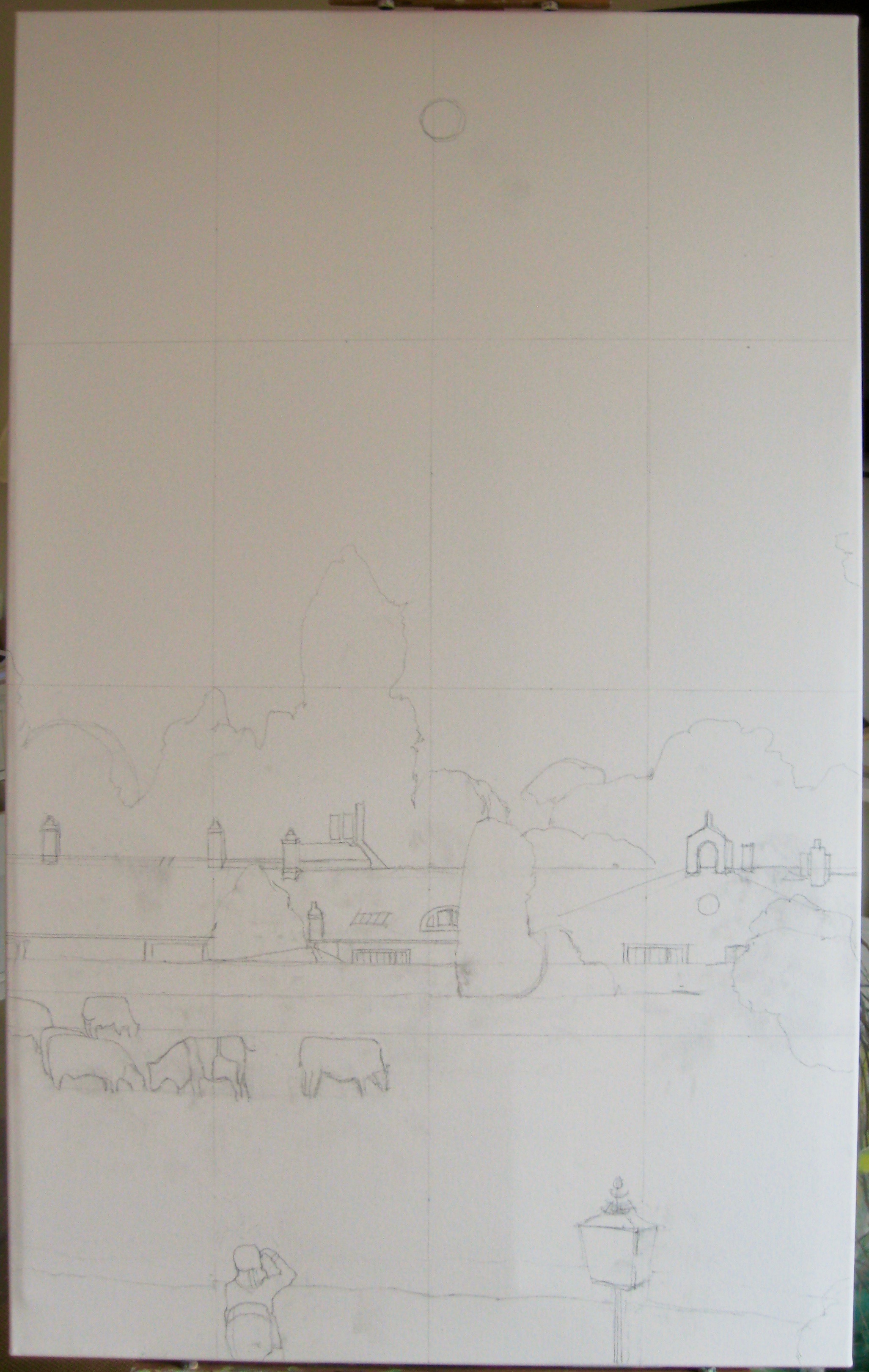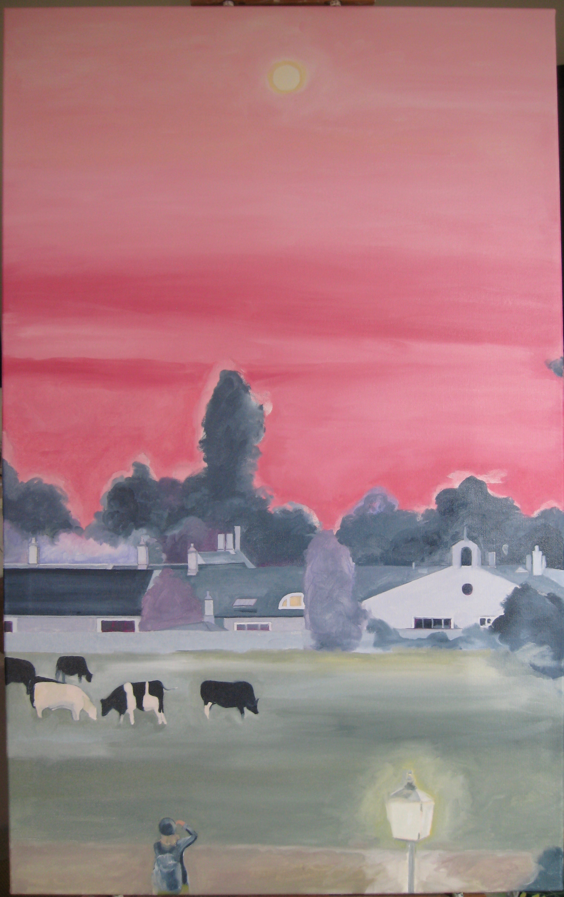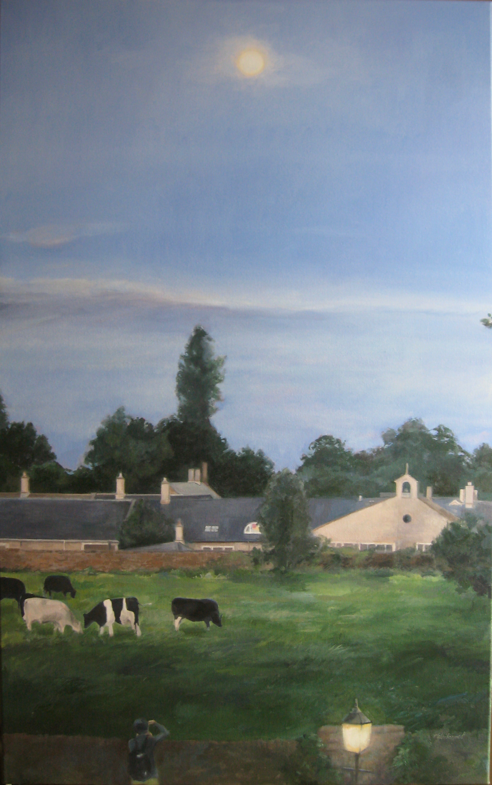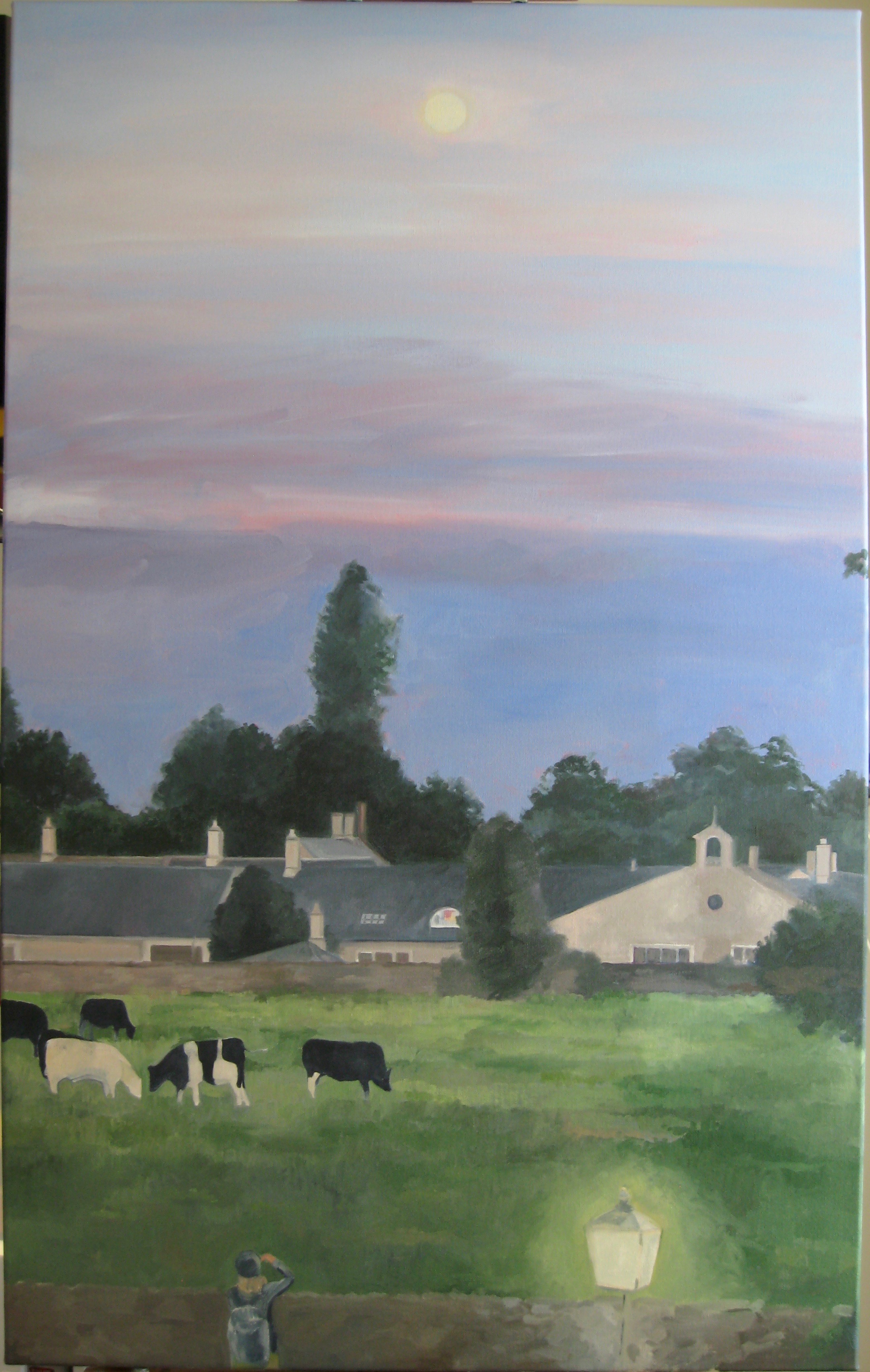 I refined the sky with the ever-present British clouds skirting the horizon, and added details to the incredible farm buildings in the distance. I watched this scene from my window until just the moon lit the sky.  The cows didn’t stray far.