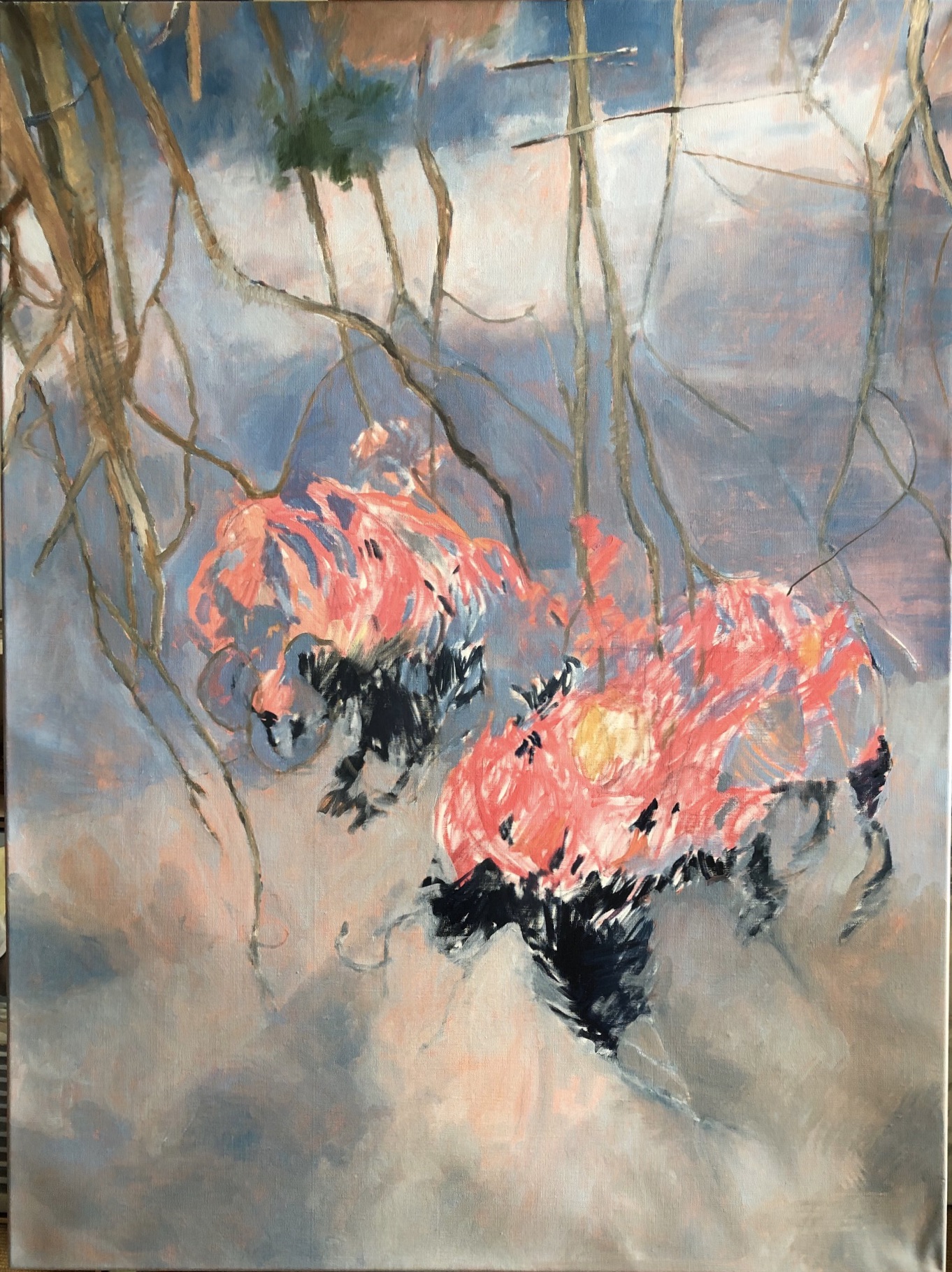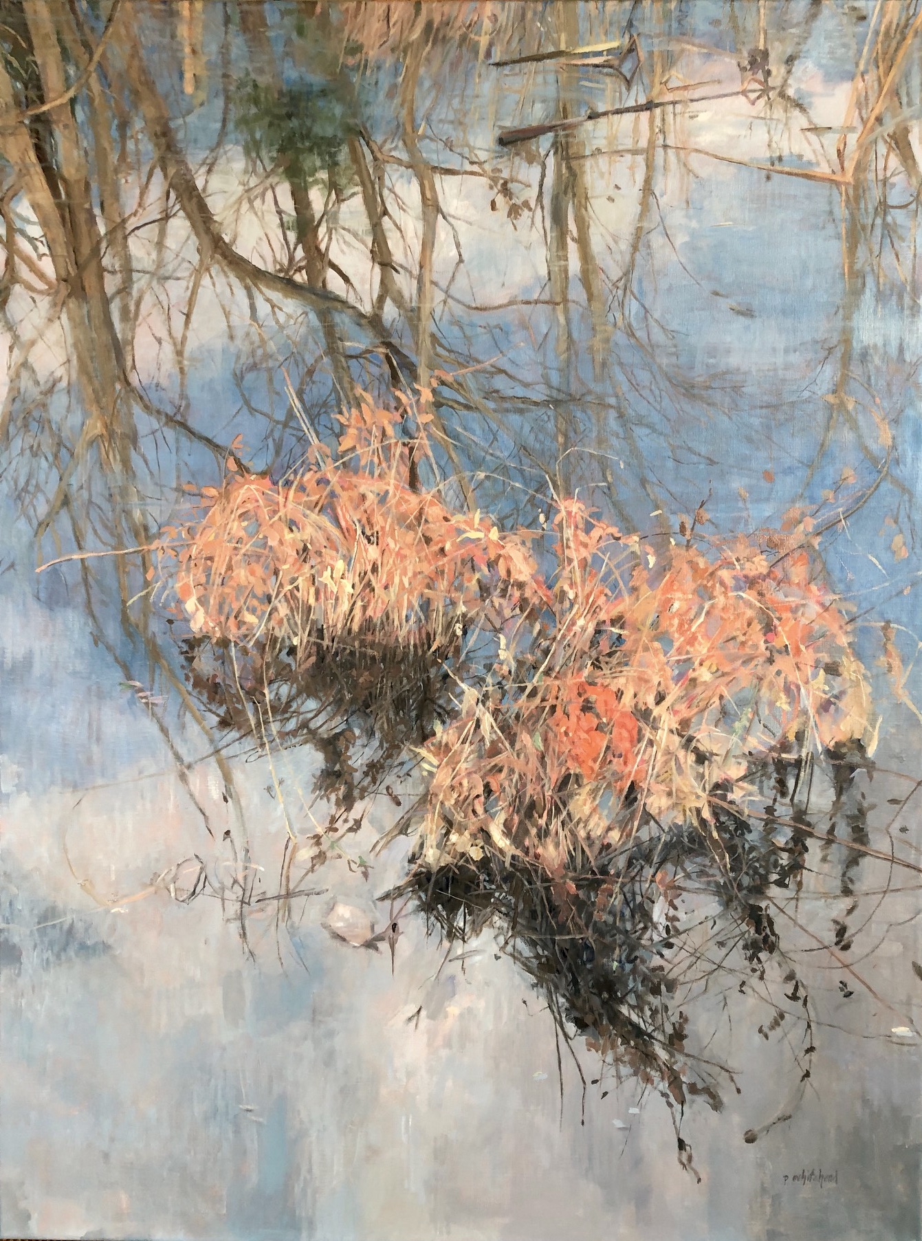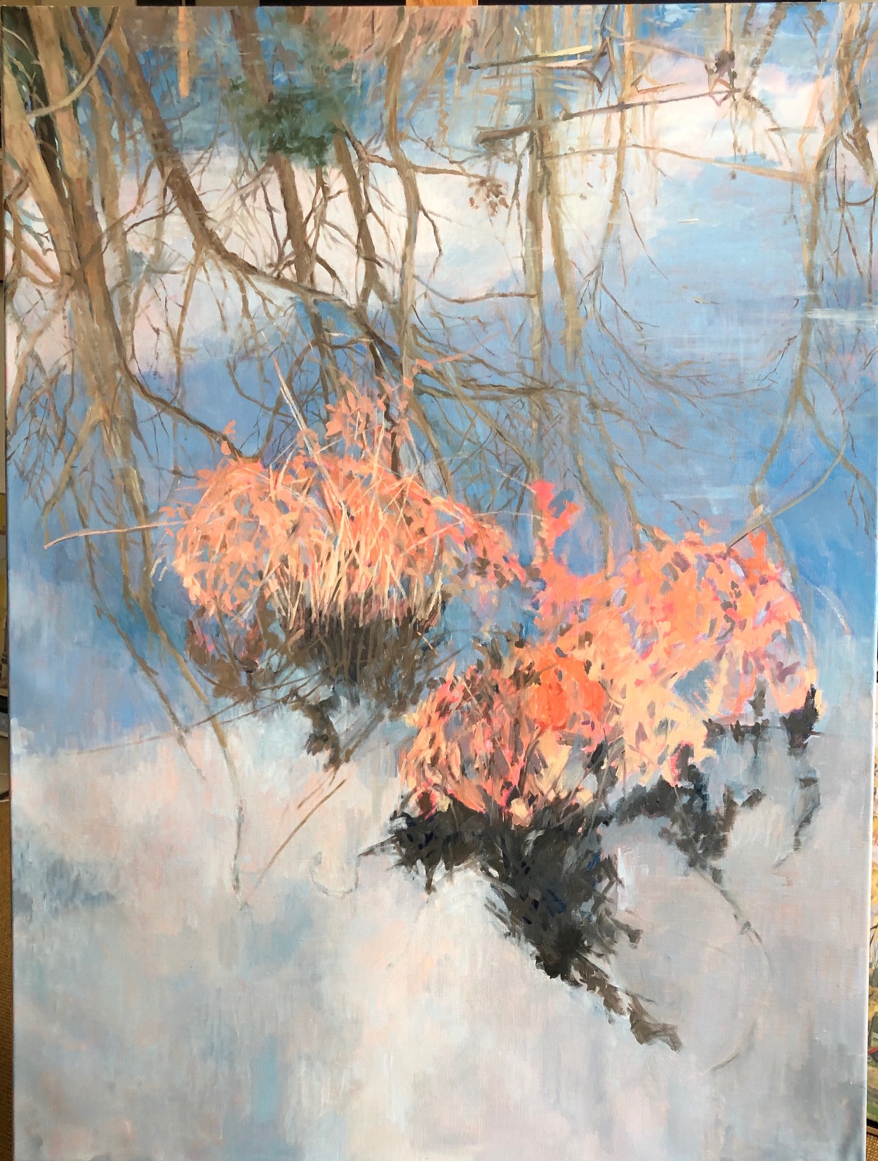 “Wetlands in Orange and Blue”, 30 x 40″, oil on linen