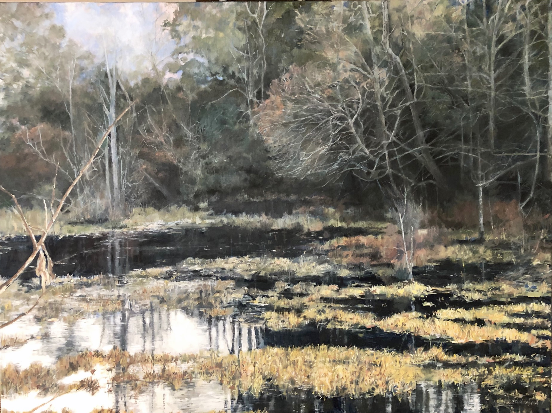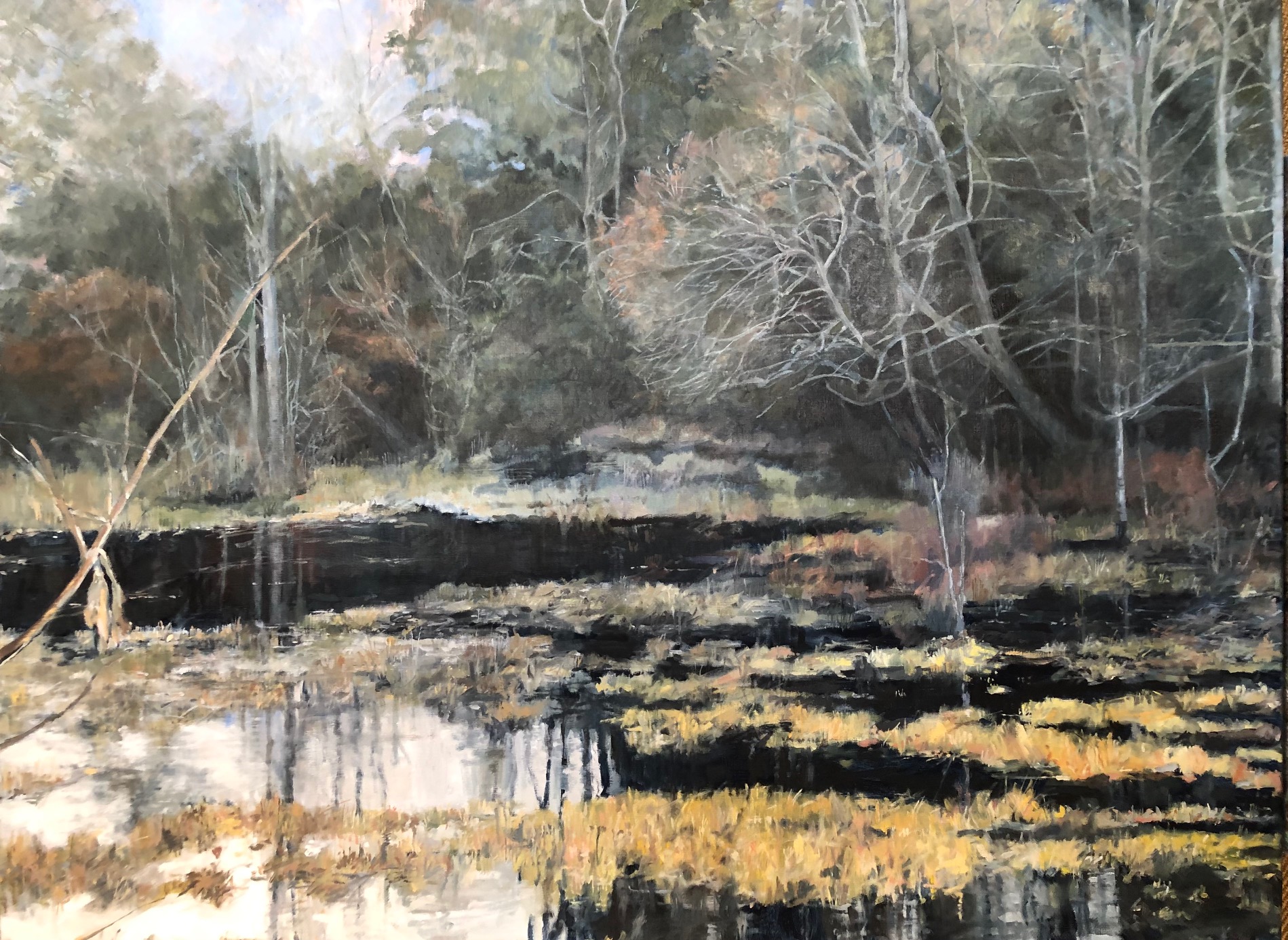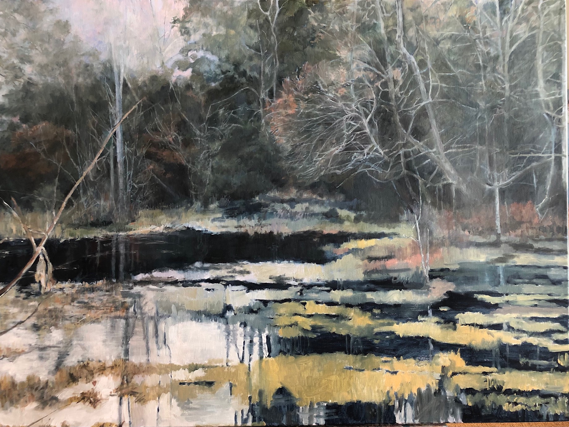I have returned again to Mason Neck Virginia State Park for inspiration. Based on a photo I took last December on the edge of the wetlands, the light finally breaks through the tangled, muted winter tones.