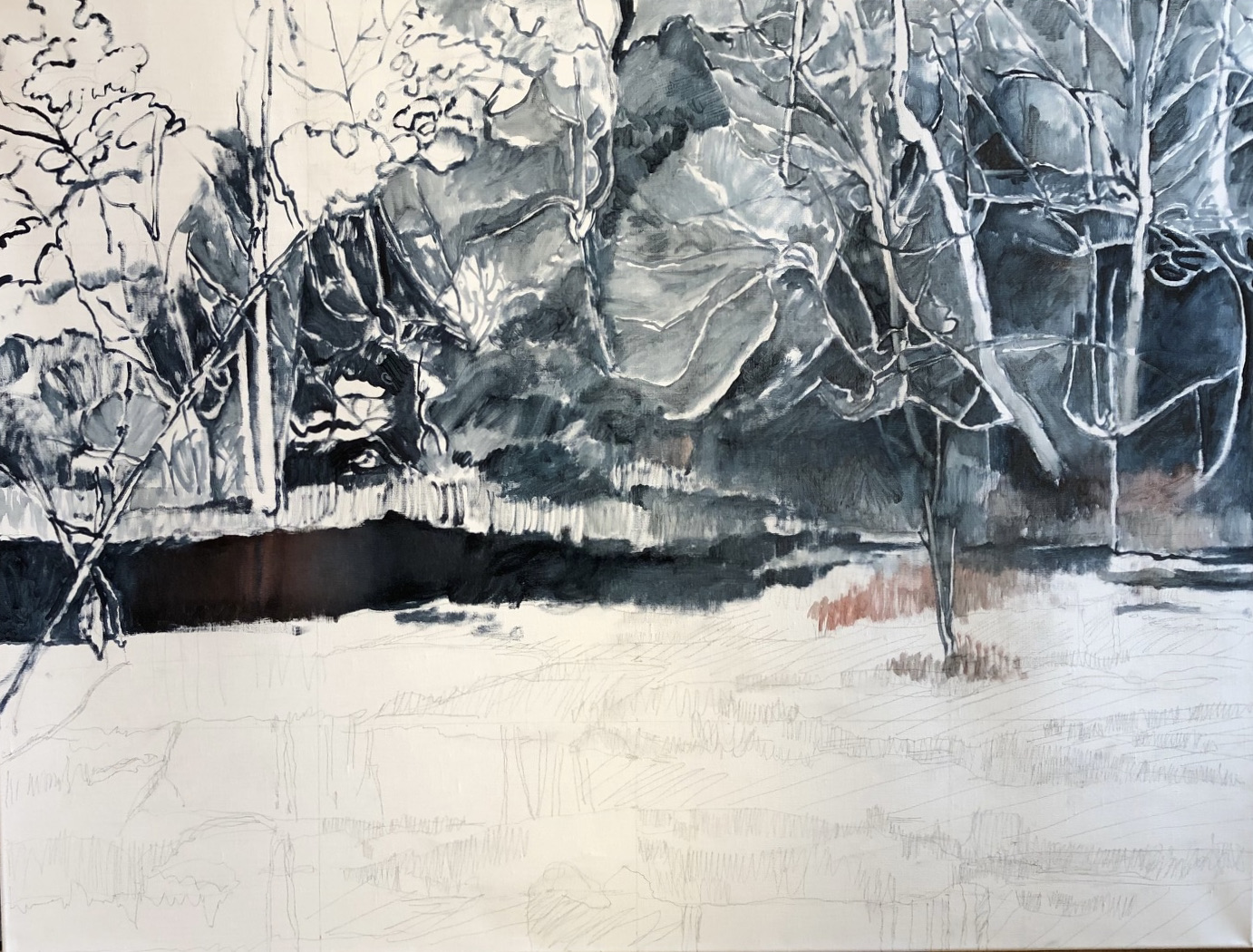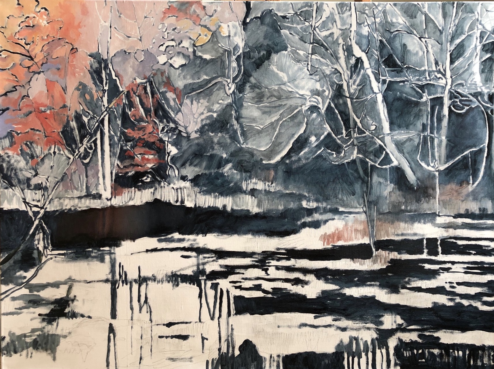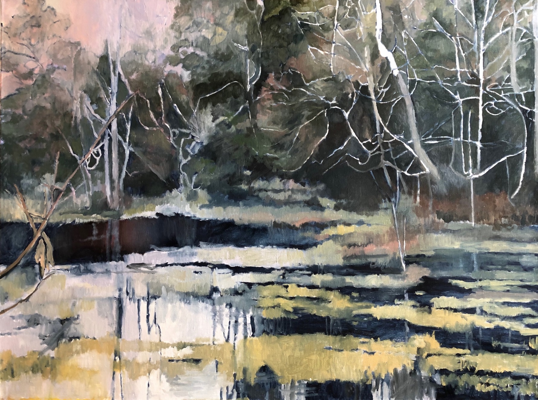 I have returned again to Mason Neck Virginia State Park for inspiration. Based on a photo I took last December on the edge of the wetlands, the light finally breaks through the tangled, muted winter tones.