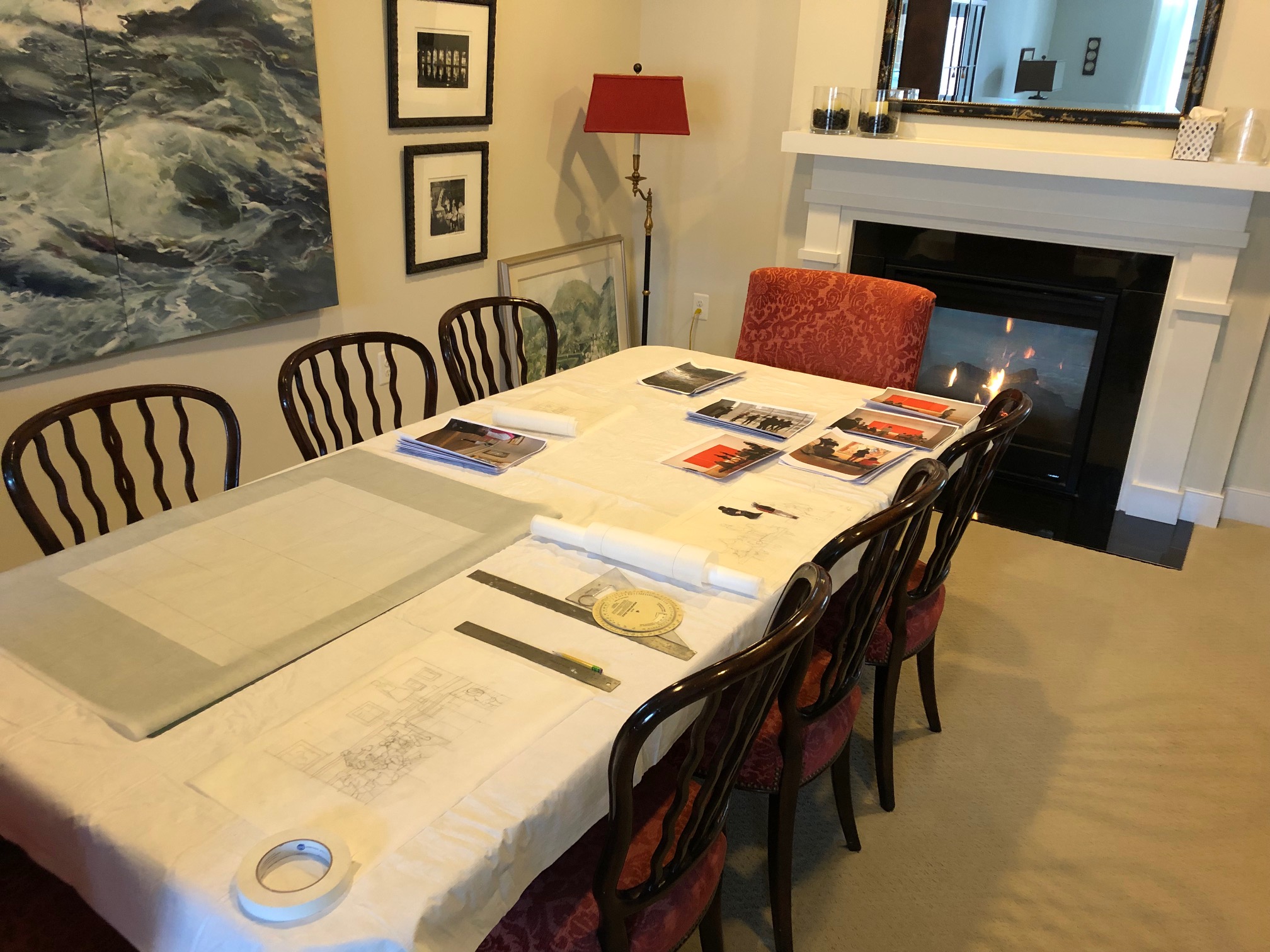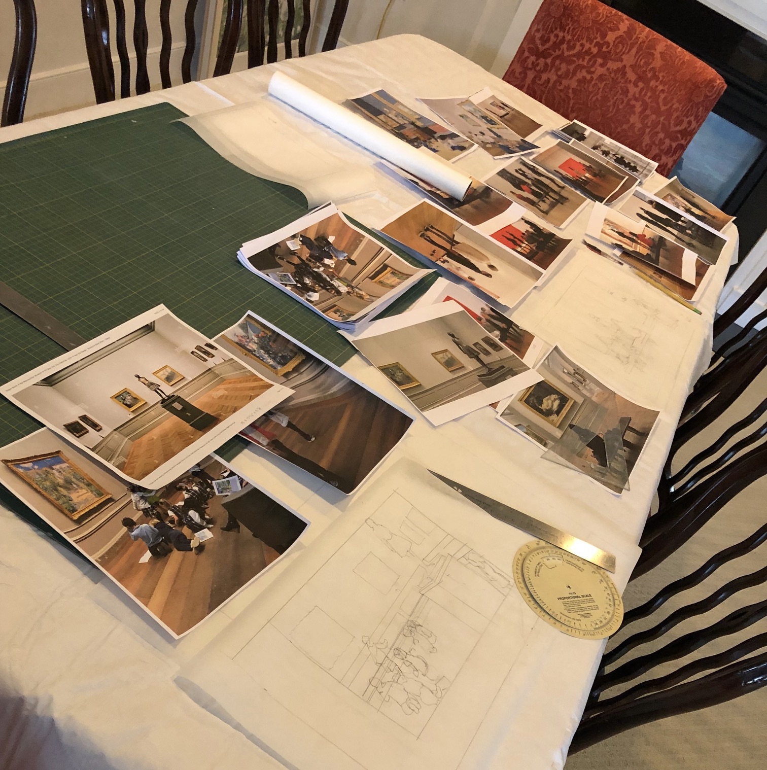 I started going through my photo files. I have lots of reference from years of museum visits, but choosing the perfect combination of gallery angles, art and figures took time and thought. The dining table in front of the fire became my workshop. It was January.