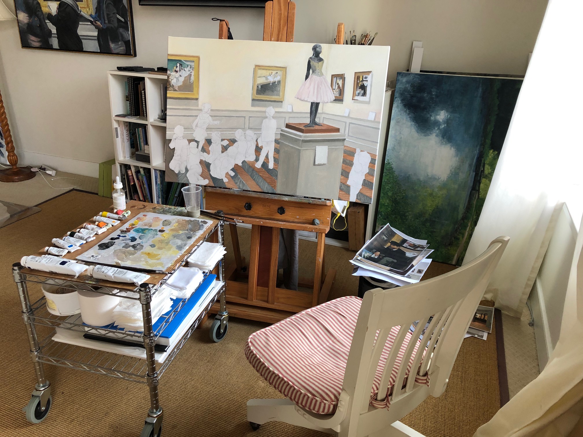 Still waiting for the larger canvas to arrive, I began to work color on The Little Ballerina. I went on line to make sure the Degas gallery at The Metropolitan Museum of Art looked the same now. Covid had kept me away for a couple of years. I was surprised to learn that they had put a new skirt on the dancer. It is now longer, fuller and a beautiful pale ivory blush, different from what I had in my older photos. There is a wonderful Met video on YouTube explaining why they decided to do it and the process they used. Fascinating.