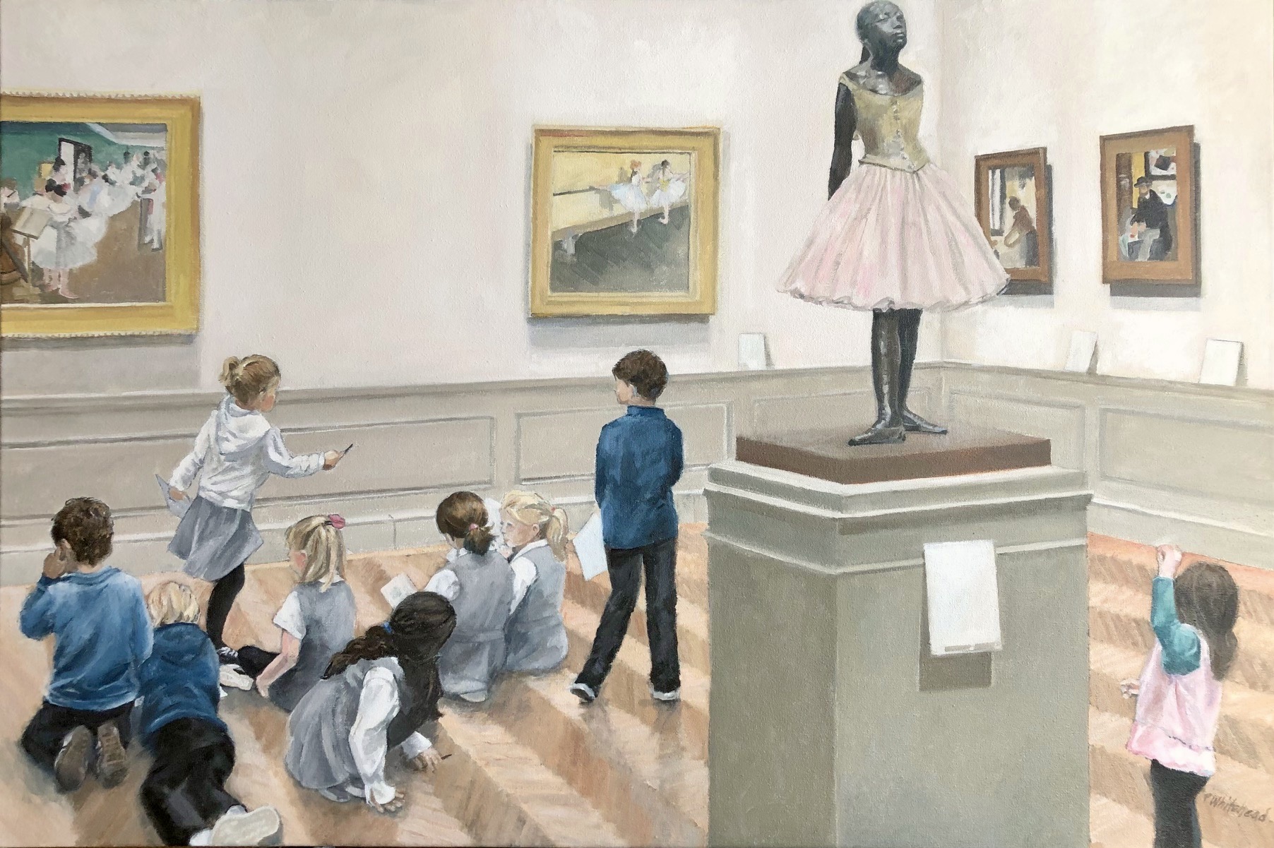 One was a large 60 x 40″ canvas that would feature Barnett Newman’s Air Heroicus Sublimis at MOMA (The Museum of Modern Art in New York City). For the other, which was to include a school visit, I chose one of my favorite galleries at the Metropolitan Museum of Art in NYC that revolved around Degas’ The Little Fourteen-Year-Old Dancer. This painting would be smaller and more intimate in scale. I had an earlier photo I had taken that I would rely on for angle. But it needed to tell a story. It needed the children.