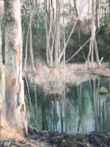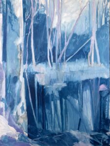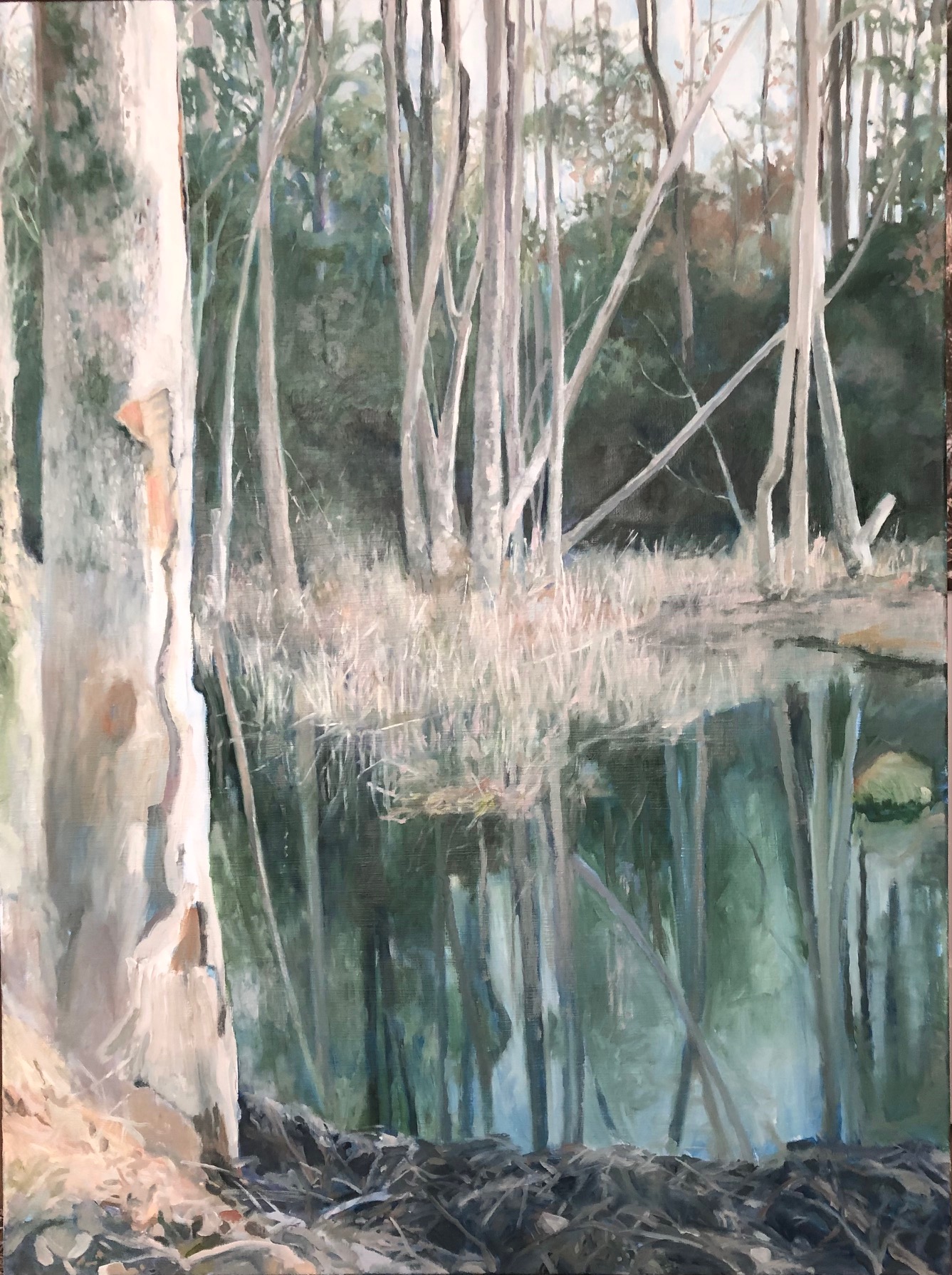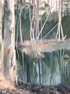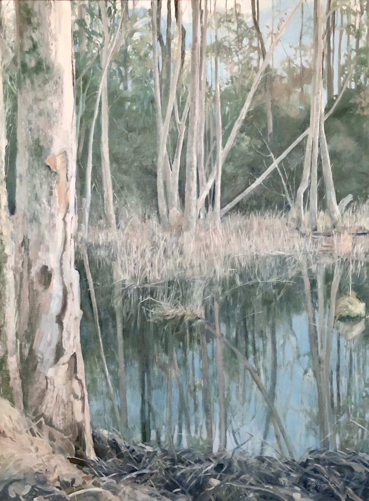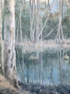 The color is layered on a cool deep blue palette, and built up to golden and blush reeds gathered around the gray-violet trees. Soft, soothing color. I think the old tree trunk on the left hand side was one of my favorite areas to work on.
