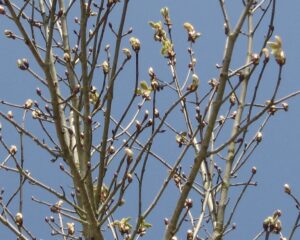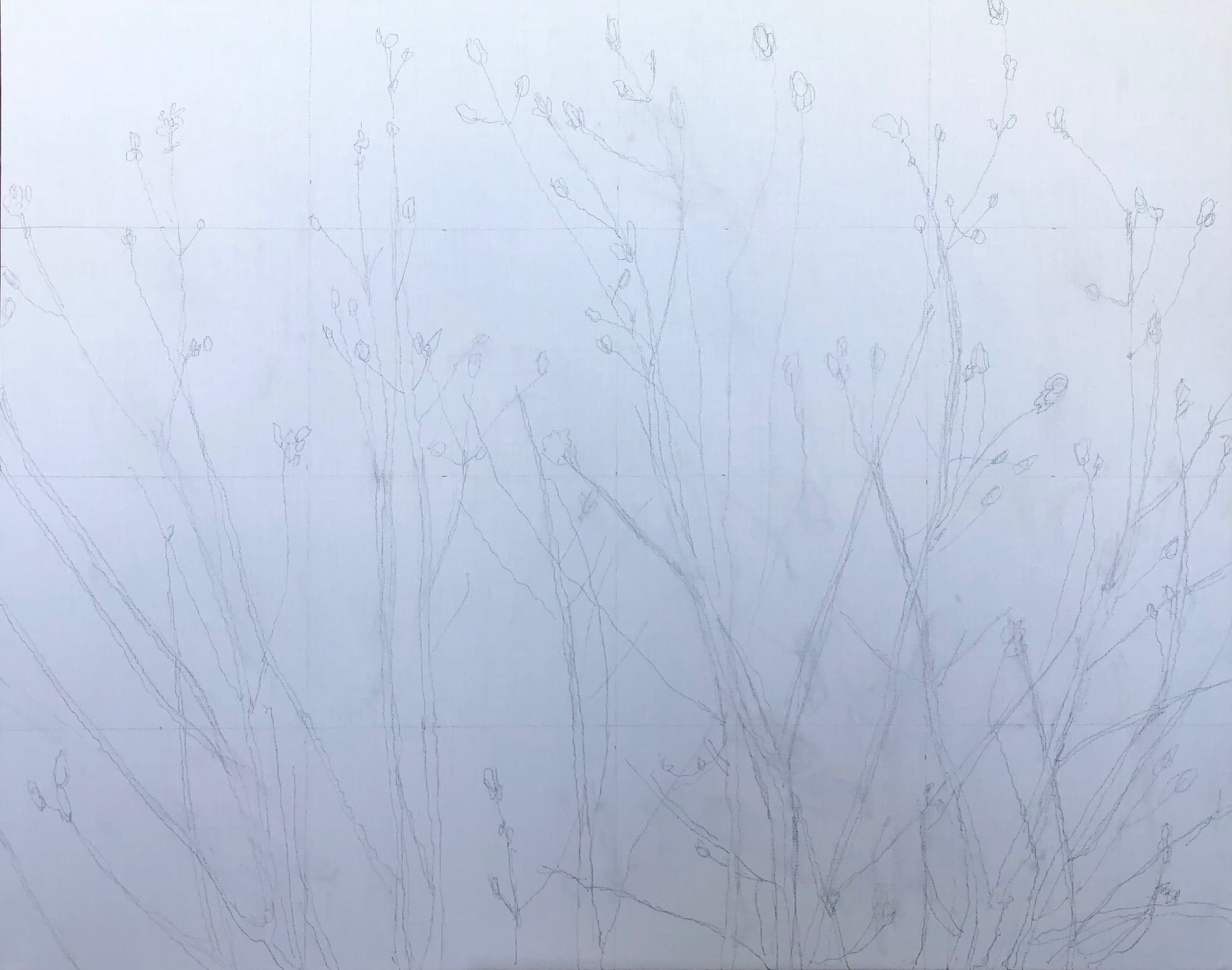 And so it begins. This one took a very long time with frequent breaks to think about where I wanted to go…how much detail, the shades to focus on, the competition of the stunning blue background and the delicate shades of yellow, pink and green in the buds. And just how many shades of taupe could there be in the branches?