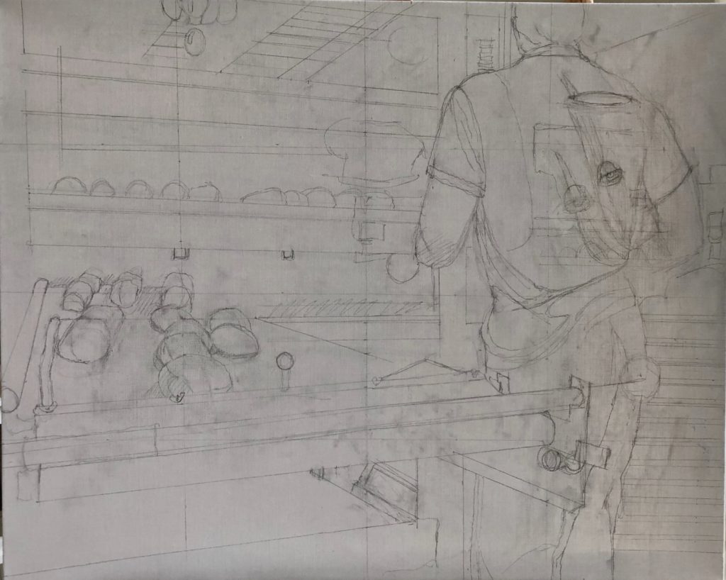 I sketched, erased, ripped up the tissue and started again.  I always want to tell a story in these gallery scenes. With all the activity of a class assignment on the left of the smaller canvas, I wanted to balance the scene with a younger child fixated on Degas dancer. She is oblivious to the chaos around her.  I finally penciled it on to the canvas.