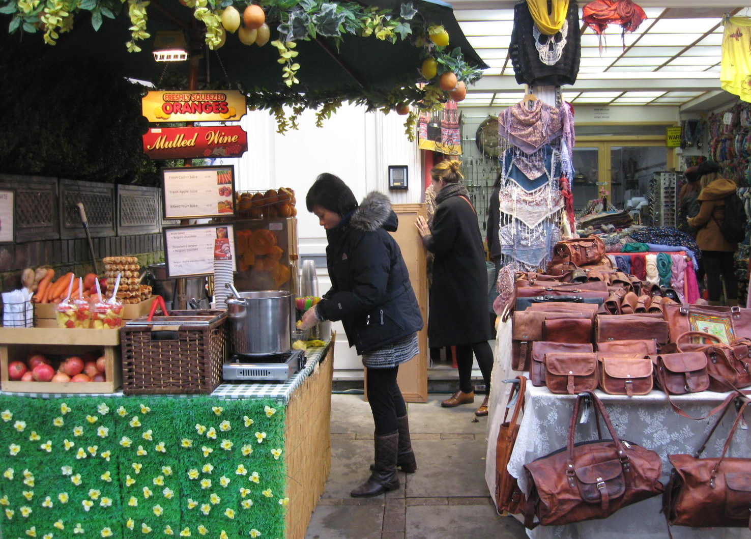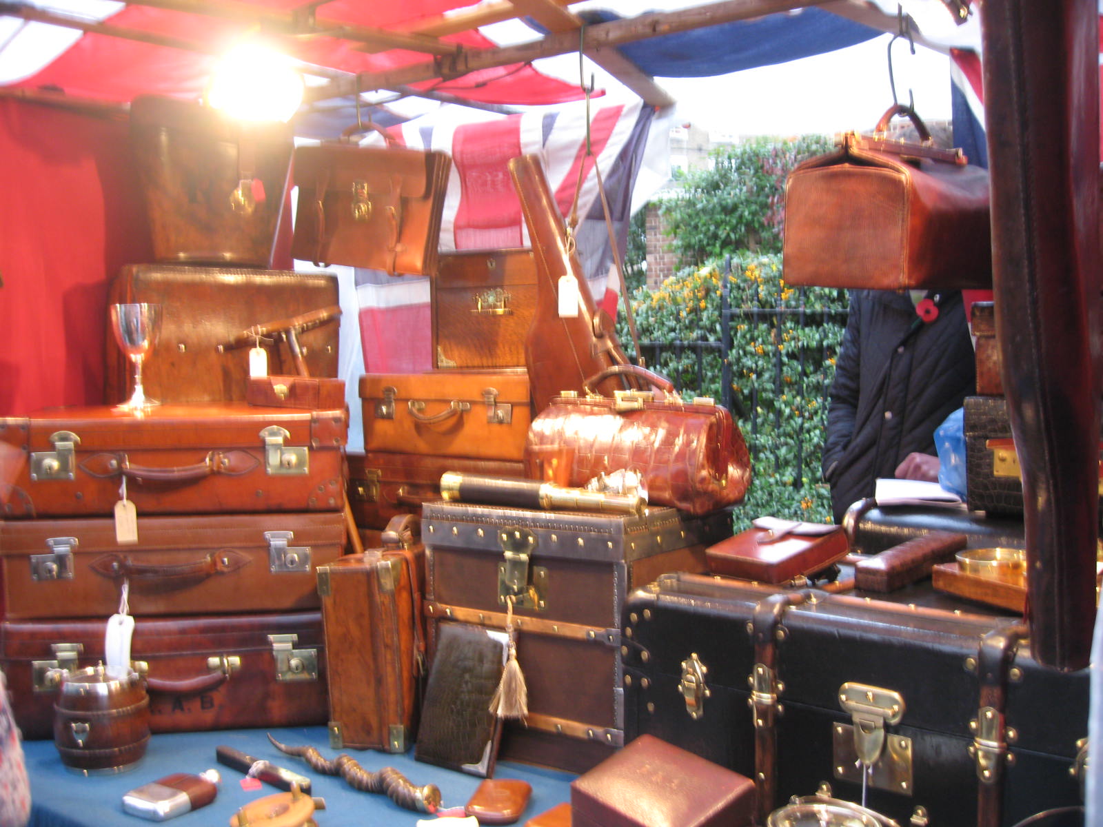 A beautiful stall of not inexpensive leather items. Photo by me