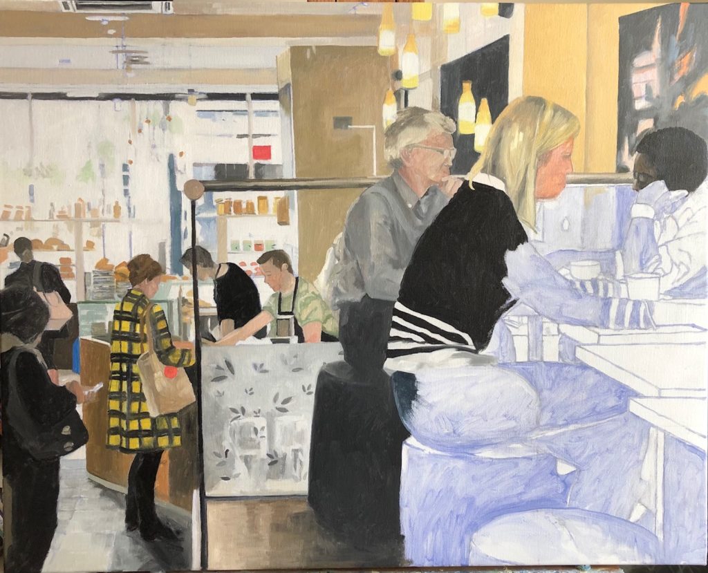 I chose a scene of a coffee shop in London from our autumn 2019 trip. This cafe was just down the street from our hotel in the Kensington area on Bayswater, steps from Notting Hill. People were out and about early morning, chatting and meeting up, catching red double decker buses. How were we to know then what was coming?