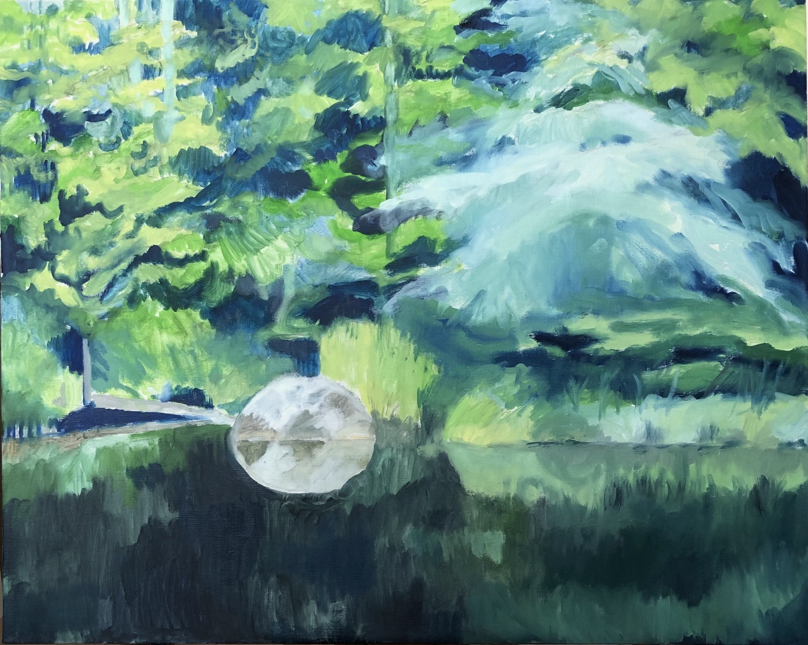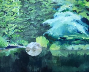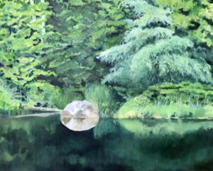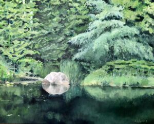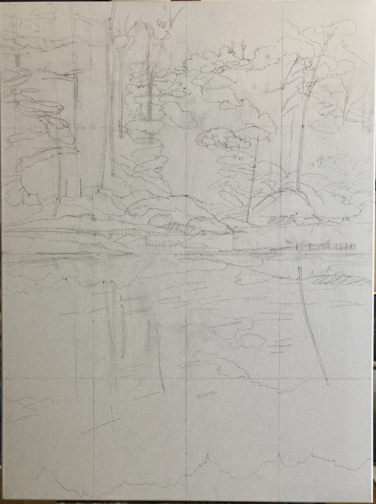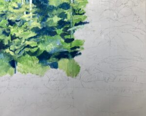 I worked at it a couple of hours each day. Then slept on it so I could look at it with a fresh eye. How much detail? How to make the patterns in the lake move and have their own rhythm.
