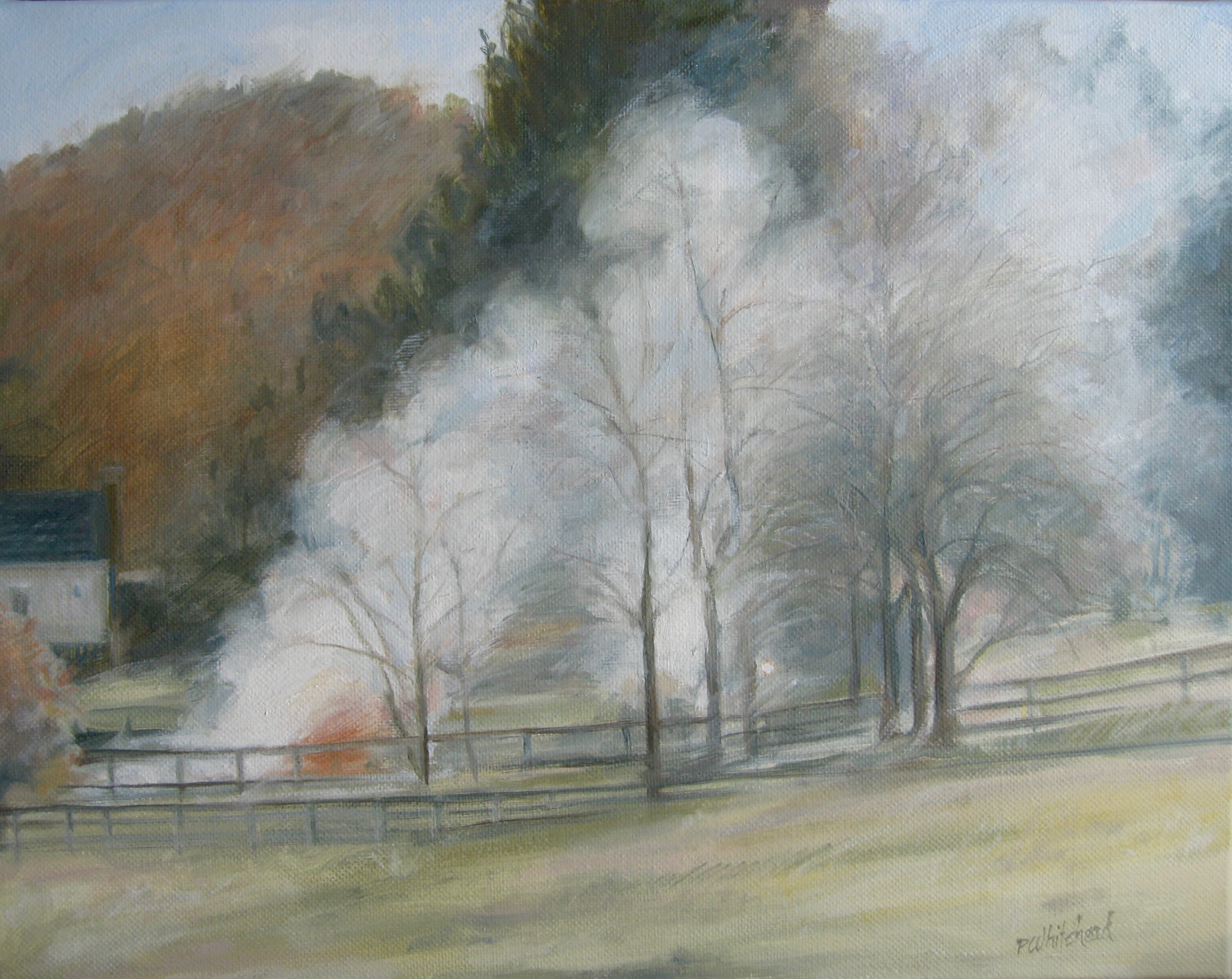 This was an image I discovered in the mountains on a morning’s drive near Little Washington in Virginia, right after we first moved. I’ve been thinking of these new images ever since, and how much they connect with images I have seen in England. Finally “Autumn Burn” popped out on canvas.