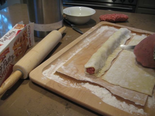 Take 1/2 of the sausage and roll it in to a long strand 12″ long. Place in center of 1/2 of the pastry.