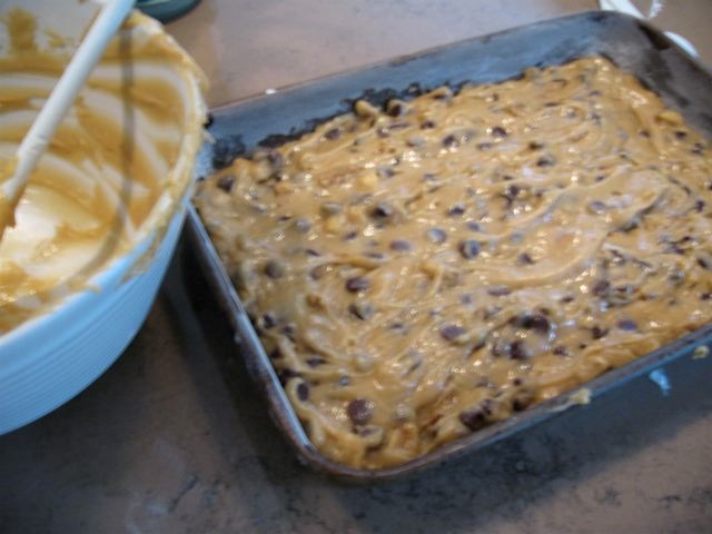 Add 2 cups of semi-sweet chocolate chips (if you lightly coat them with flour they will not sink in the batter, a trick I learned from The Barefoot Contessa), and 1 1/2 cups of chopped walnuts.