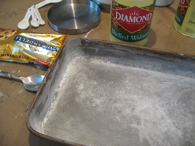 Add 2 cups of semi-sweet chocolate chips (if you lightly coat them with flour they will not sink in the batter, a trick I learned from The Barefoot Contessa), and 1 1/2 cups of chopped walnuts.