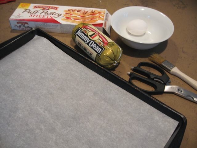 Take 1/2 of the sausage and roll it in to a long strand 12″ long.  Place in center of 1/2 of the pastry.