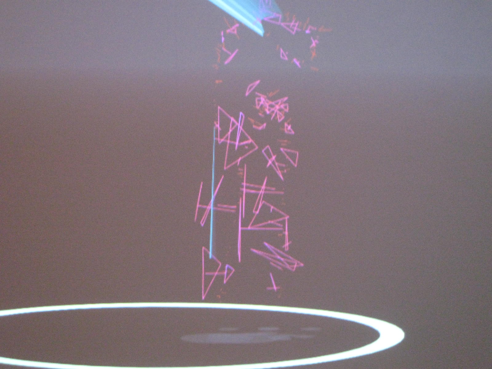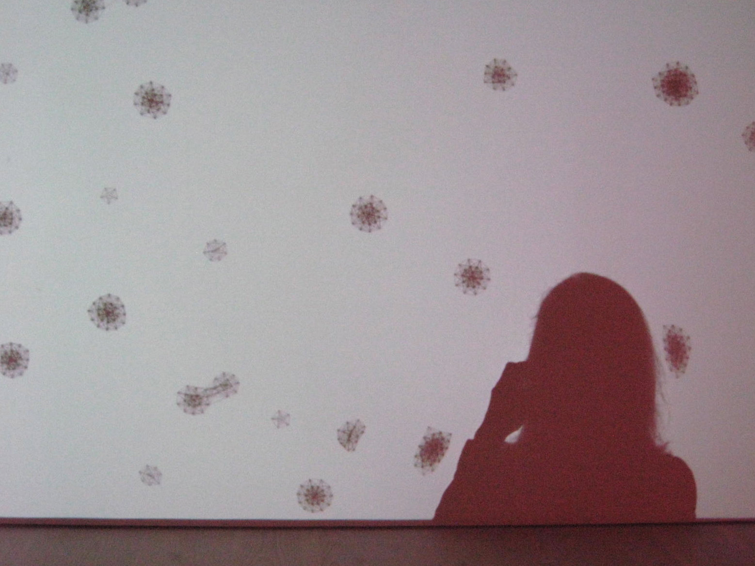 I escaped to the next floor and found a room that was interactive video. The first screen had falling snowflakes in gray on white. When my shadow hit the screen, the snowflakes bounced off of “me”.