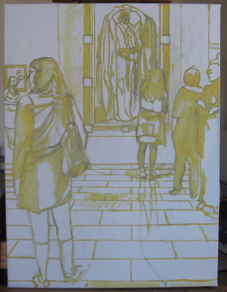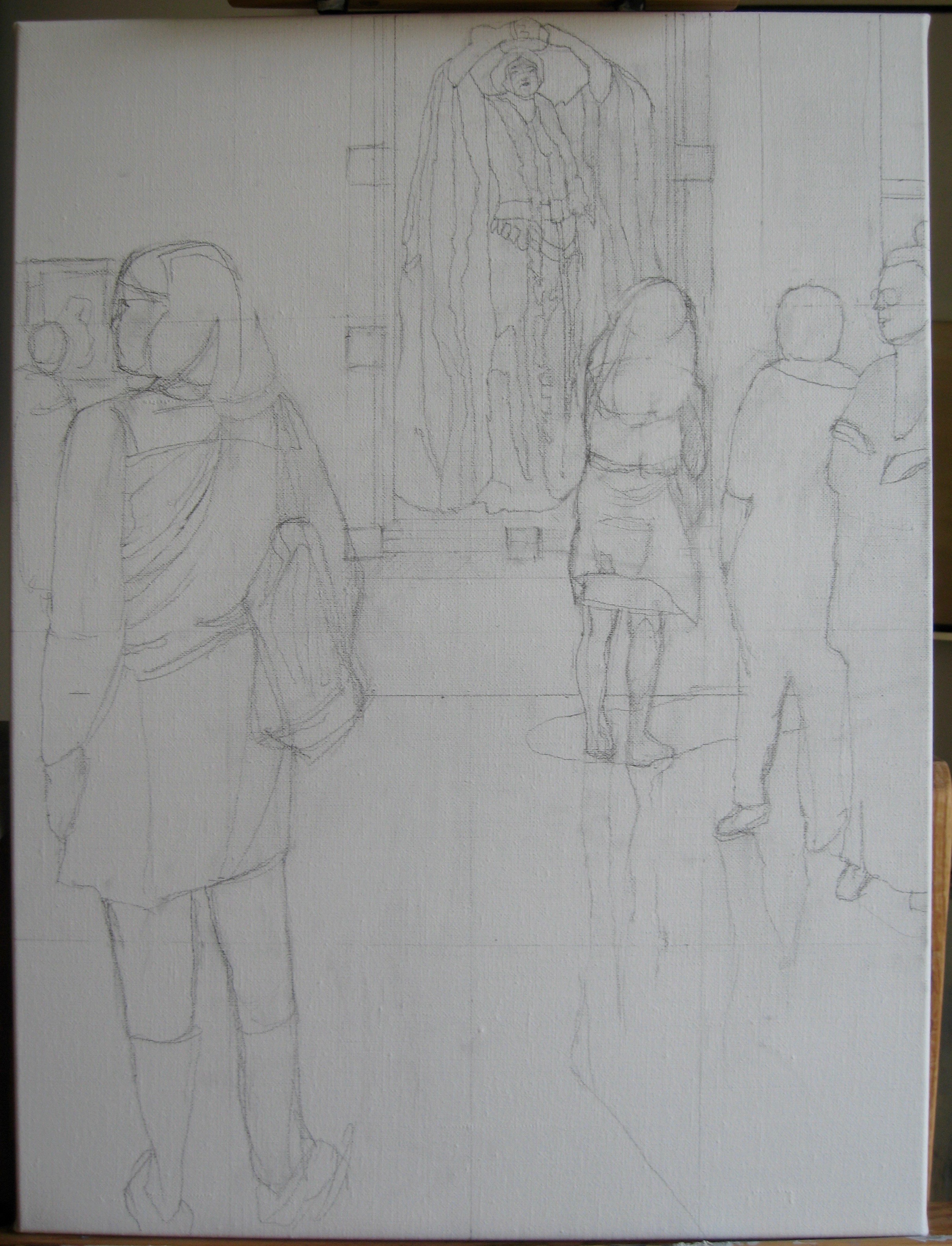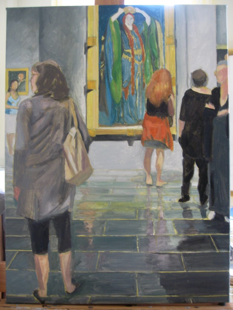 I darkened the skirt of the woman in the background on the right, moved figures in the initial sketches to create the dramatic “V” from the foreground to the painting and the red-haired girl. After days of working on Lady Macbeth’s robes with translucent layers of thinned paint, I then worked on connecting the painting to the viewers with the reflections on the floor.
