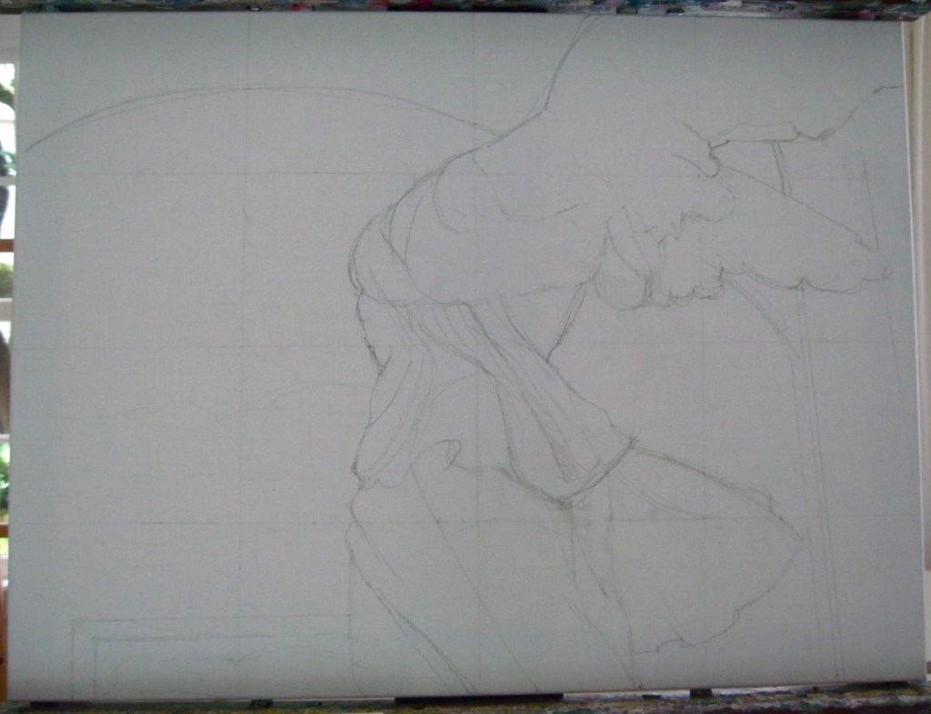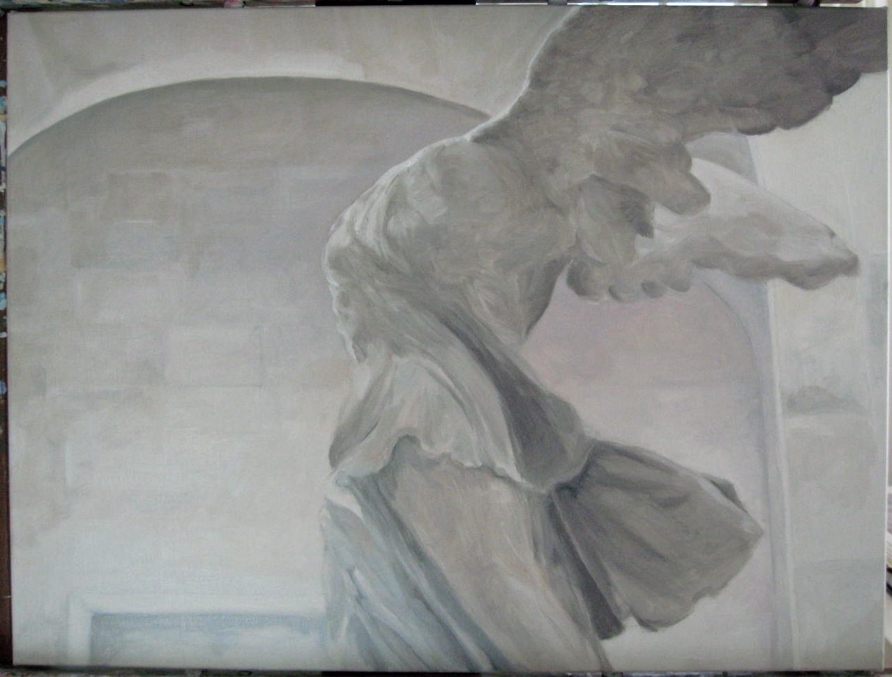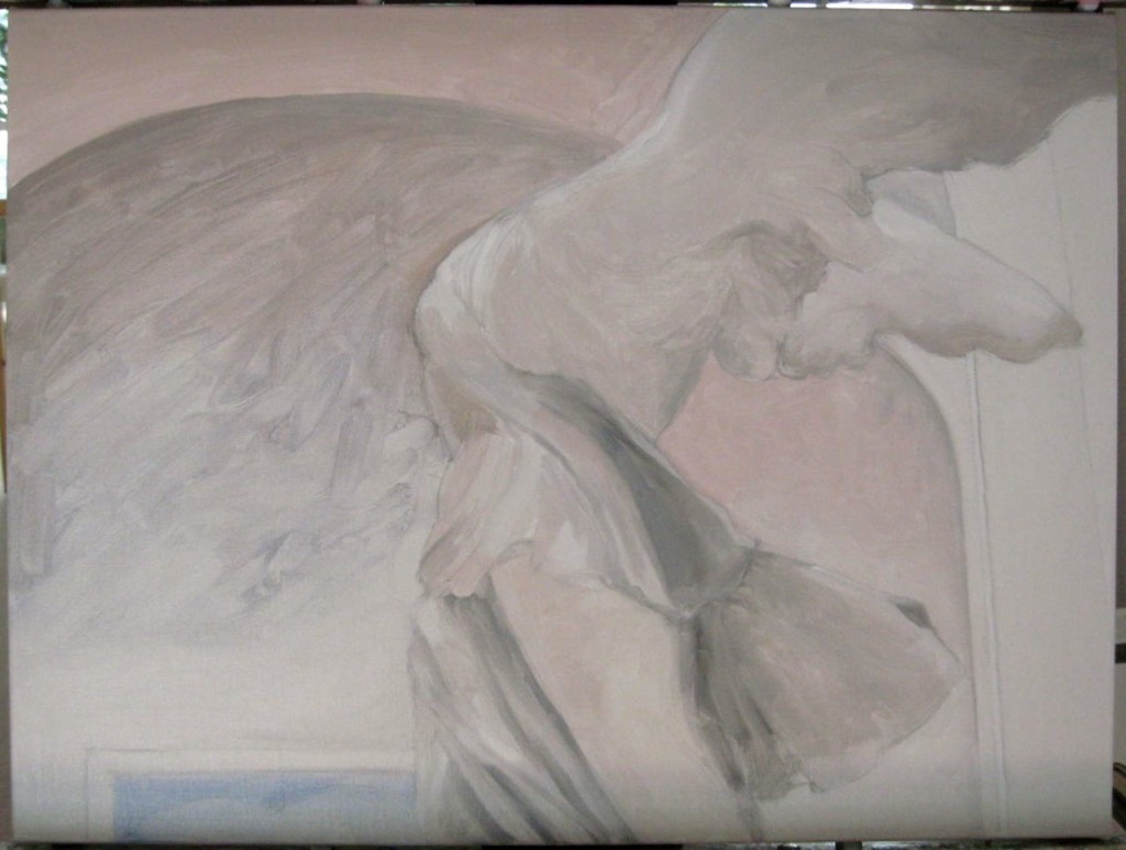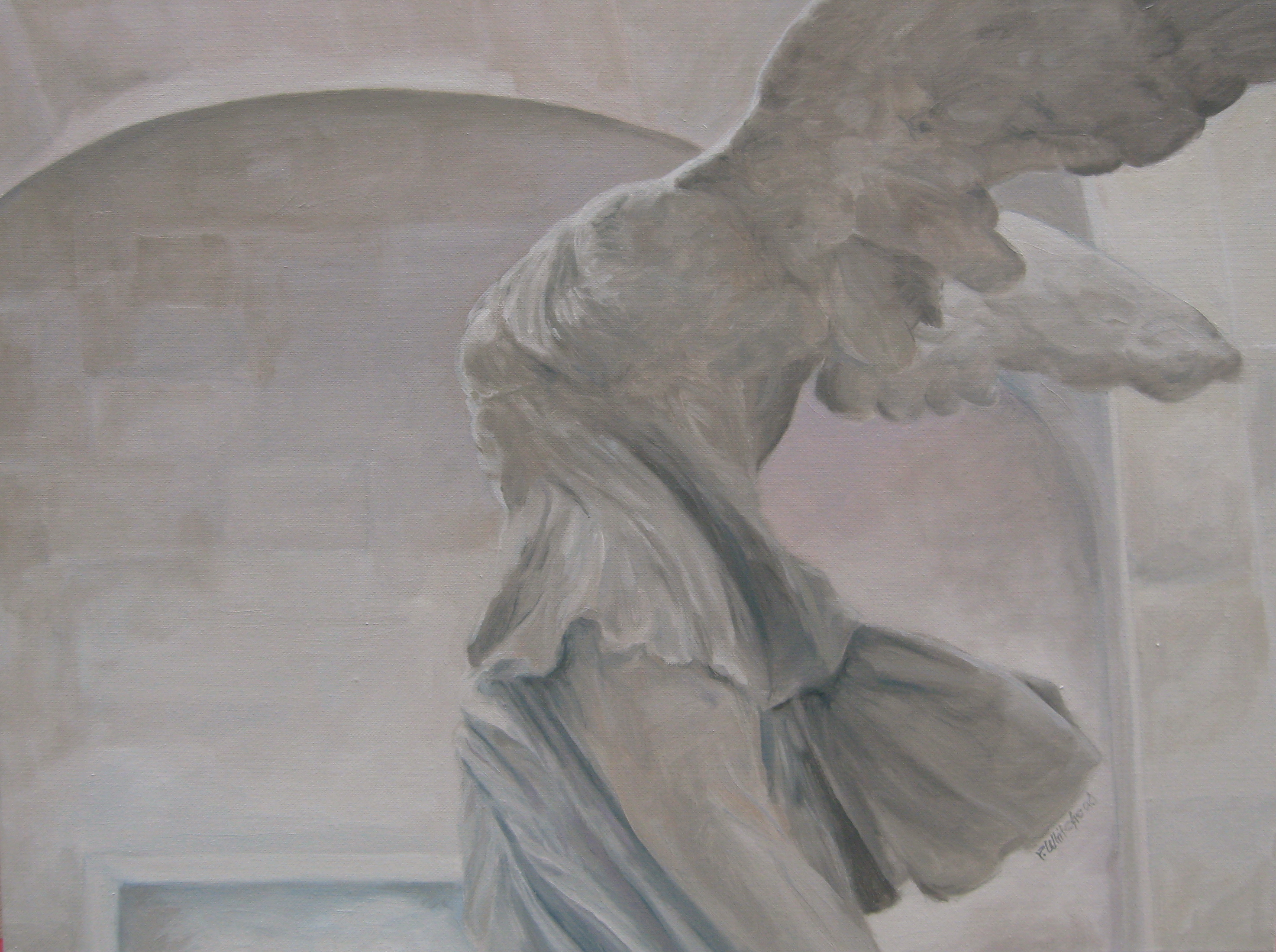 It was unearthed in 1863 on the small Aegean island. Nike (the goddess of Victory in Greek) is facing in to the wind which is blowing her garments against and behind her. This was one of my favorite parts to paint. To concentrate on the delicate folds cut from stone, was to admire the fantastic skill of a long gone artist.