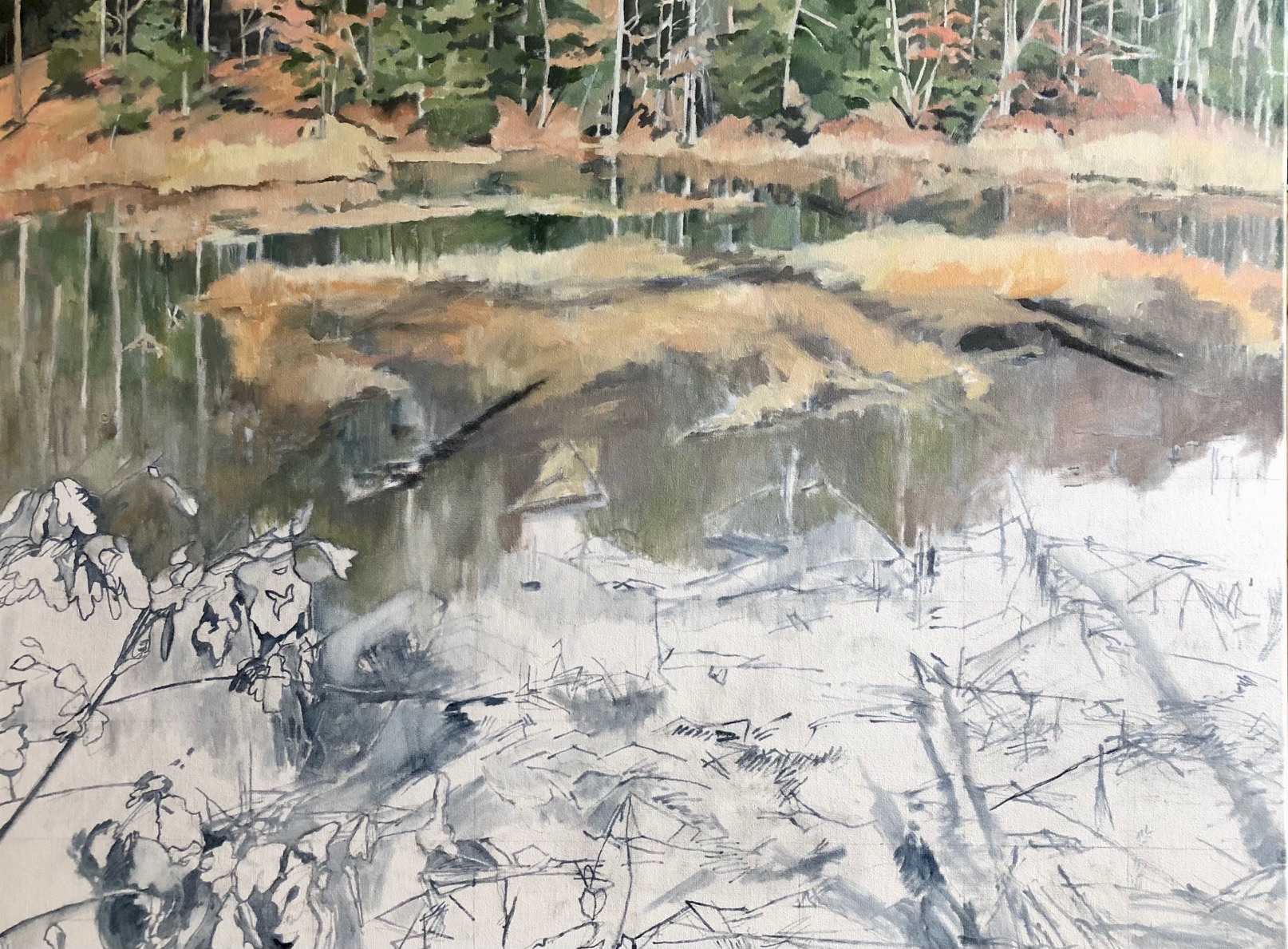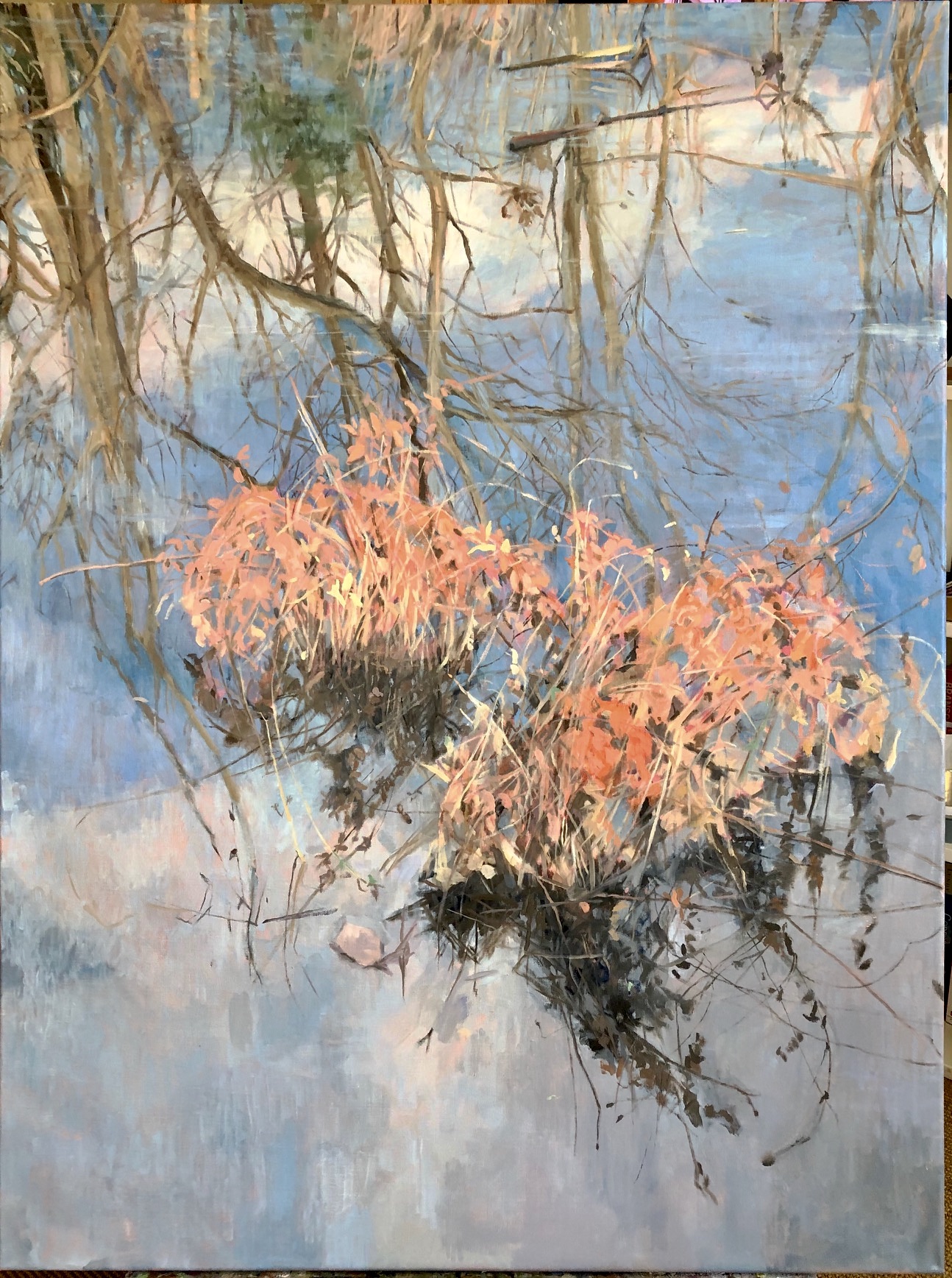 It’s August. Summer is in full heat, and I have spent the past couple of months painting a December scene of one of my favorite wetlands at Mason Neck Virginia State Park. It has kept me cool and calm the past two months of this beastly summer.