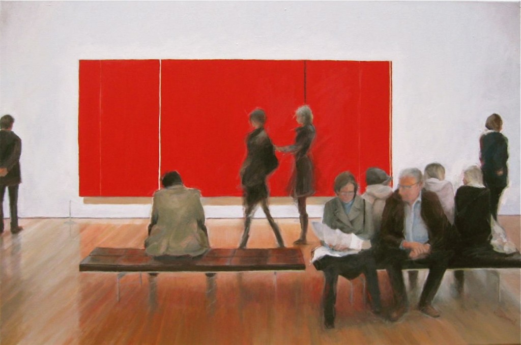 And the man on the bench is in the direct path of the painting’s reflection. The deep red of the painting runs across the wooden floor.