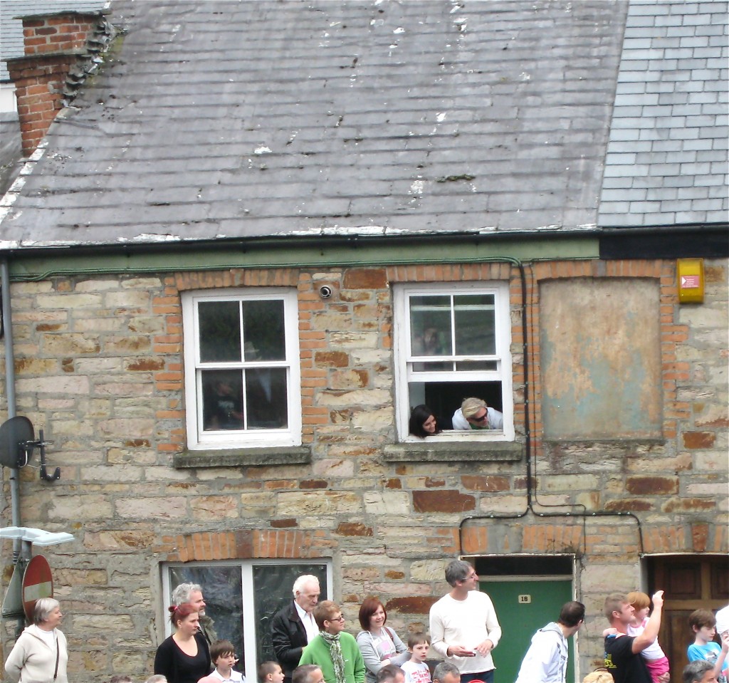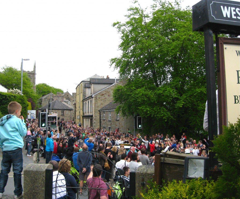 The excitement kept building for an hour waiting for the athlete to come running down the main street. photo by me