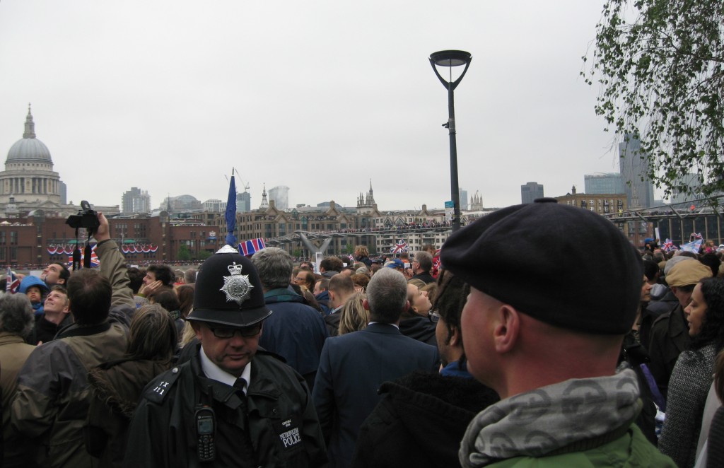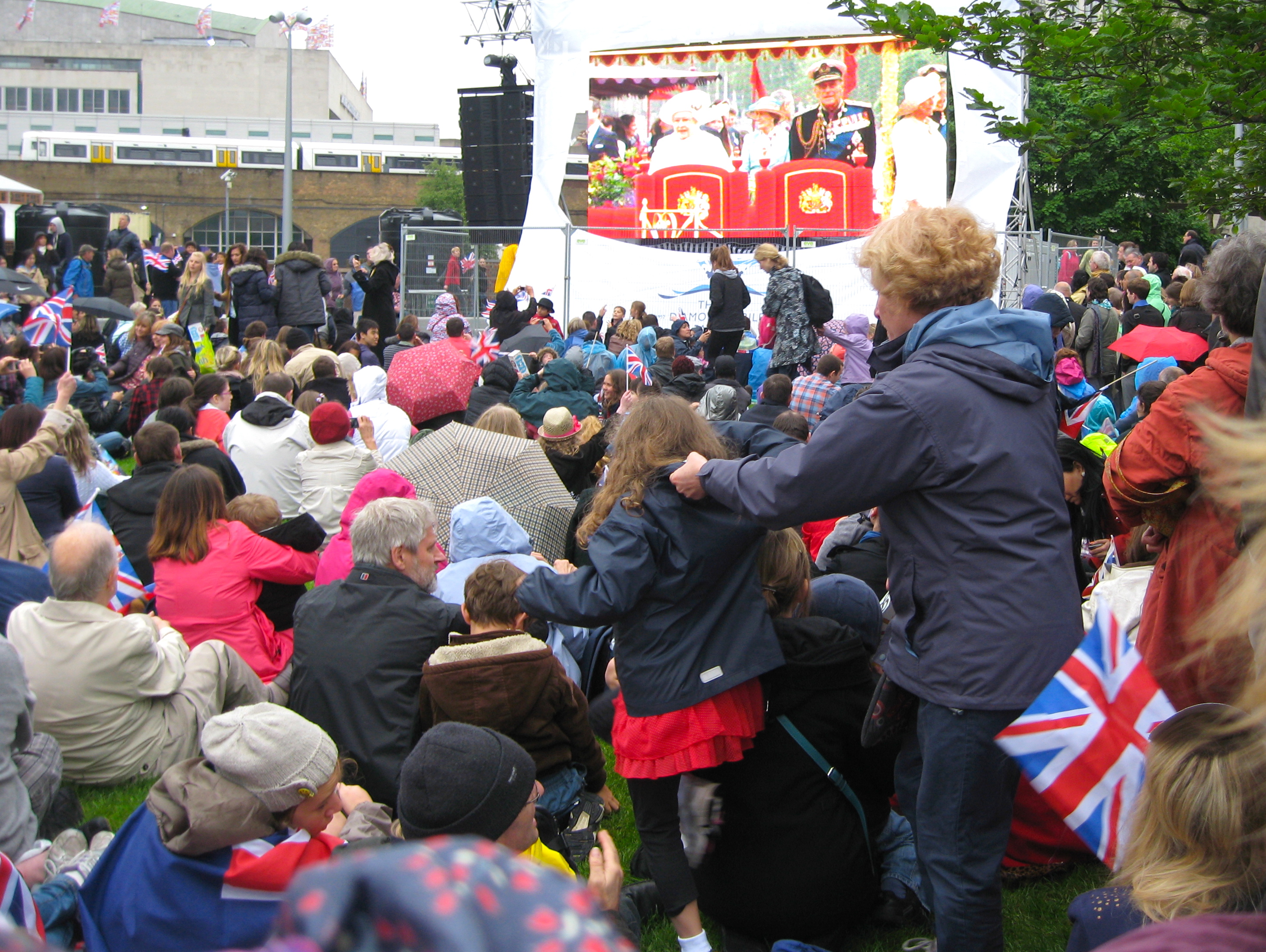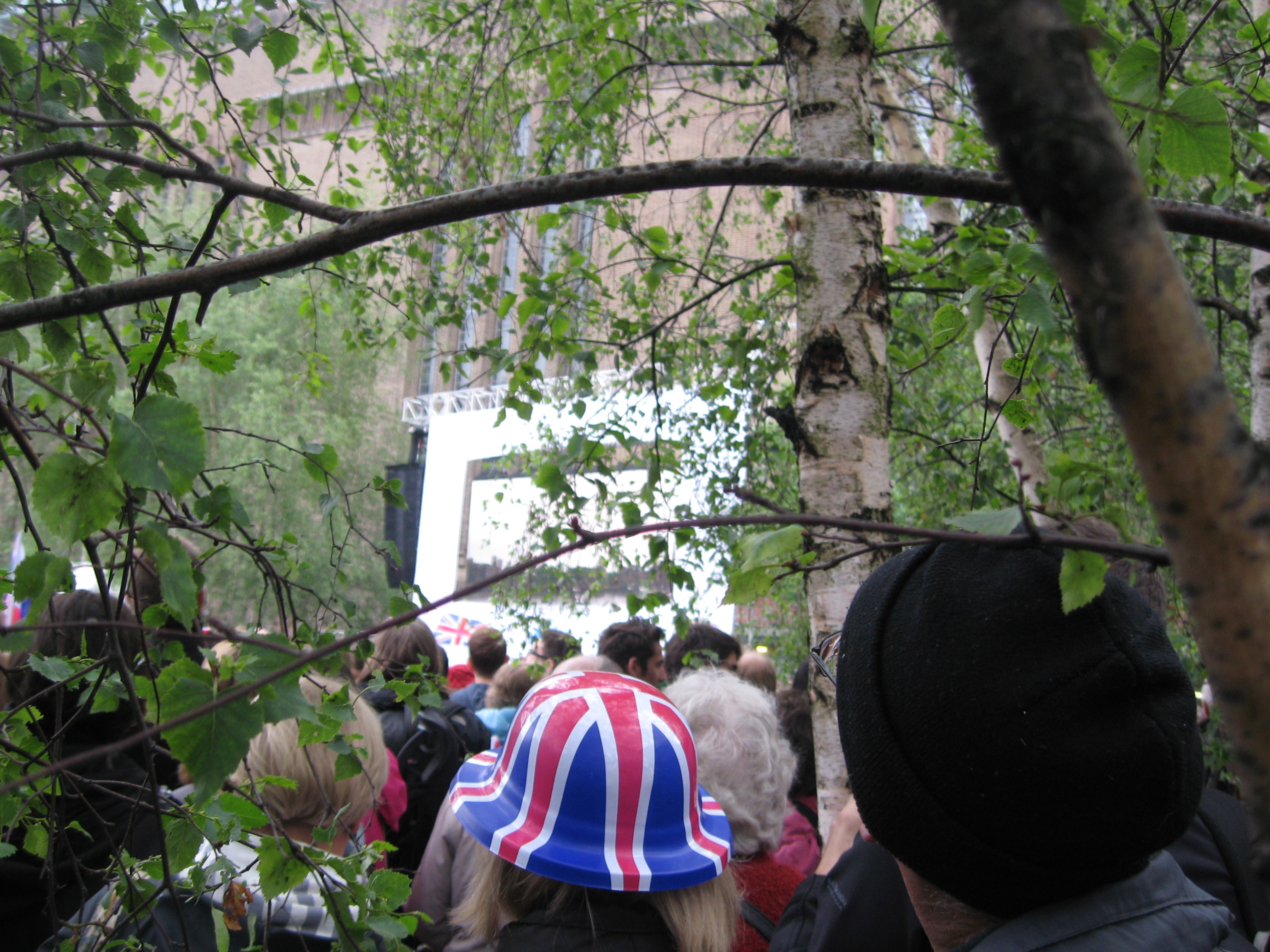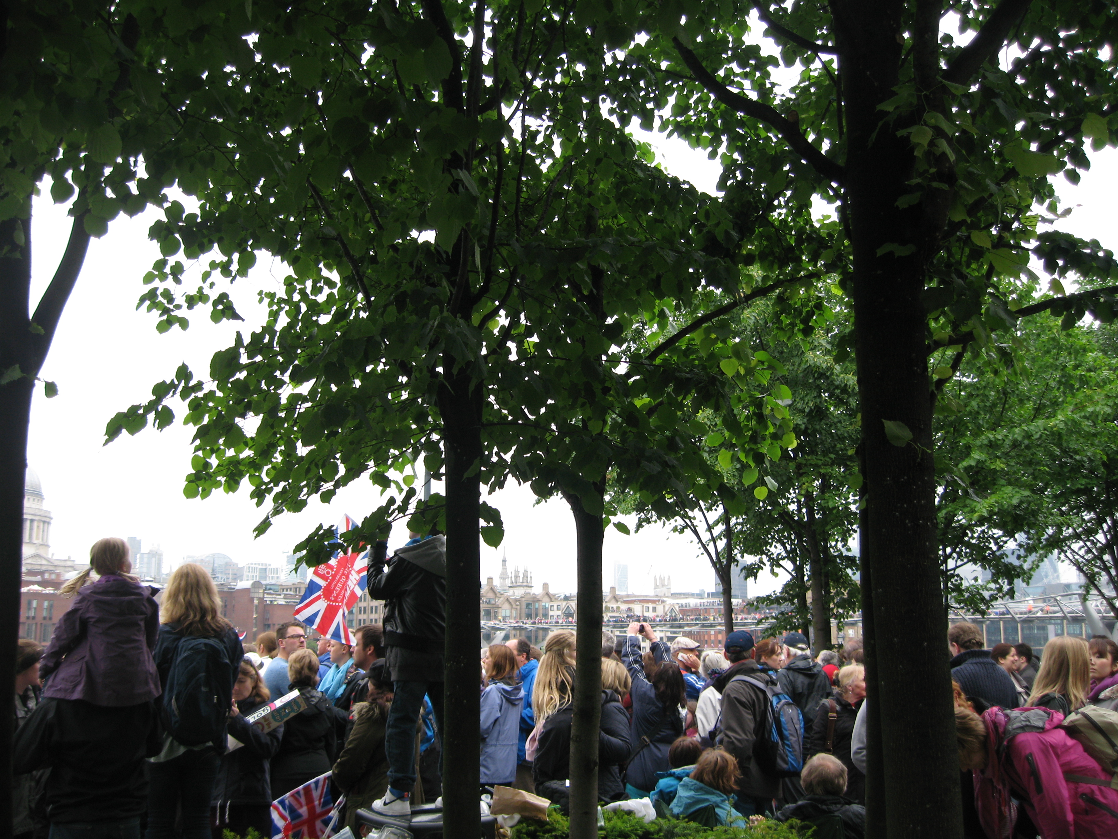 I could see this area wasn’ t going to work out, and I could tell by the crowds cheering watching the screen that the Queen had boarded the barge to start her trip up the Thames. There were helicopters overhead and bells were ringing.