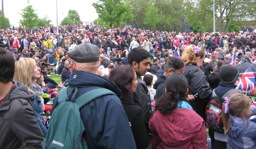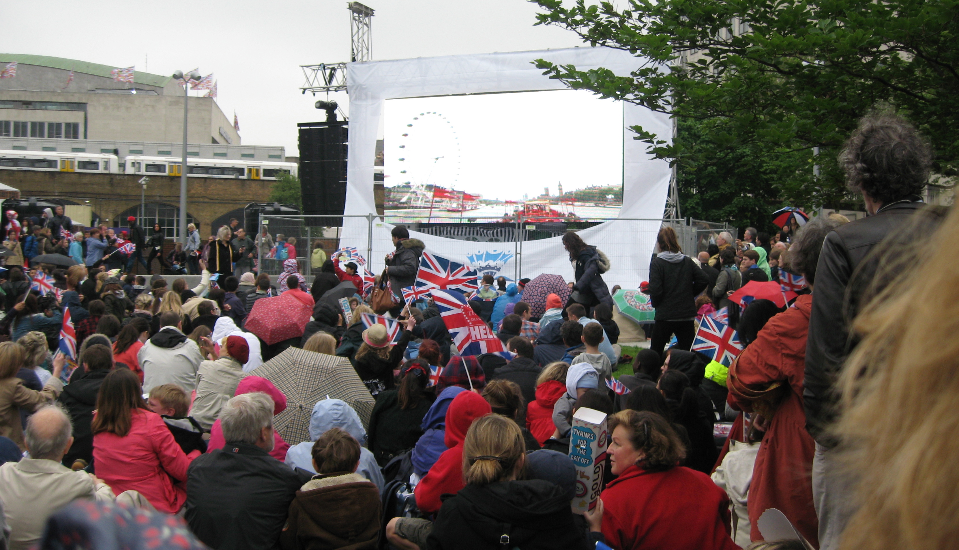 And when the image came on the giant screen showing that the Queen’s barge was right behind us on the river, and you could hear the salutes, the crowd went wild. Flags were waving and people were cheering. The woman next to me said it made it all worth while coming out to see it live, and not sitting at home watching it on her tellie with a cup of tea.