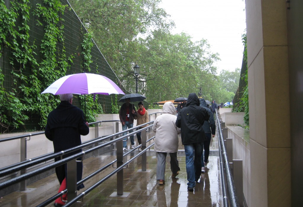 Coming out of the Green Park Underground Station in the wet. Photo by me