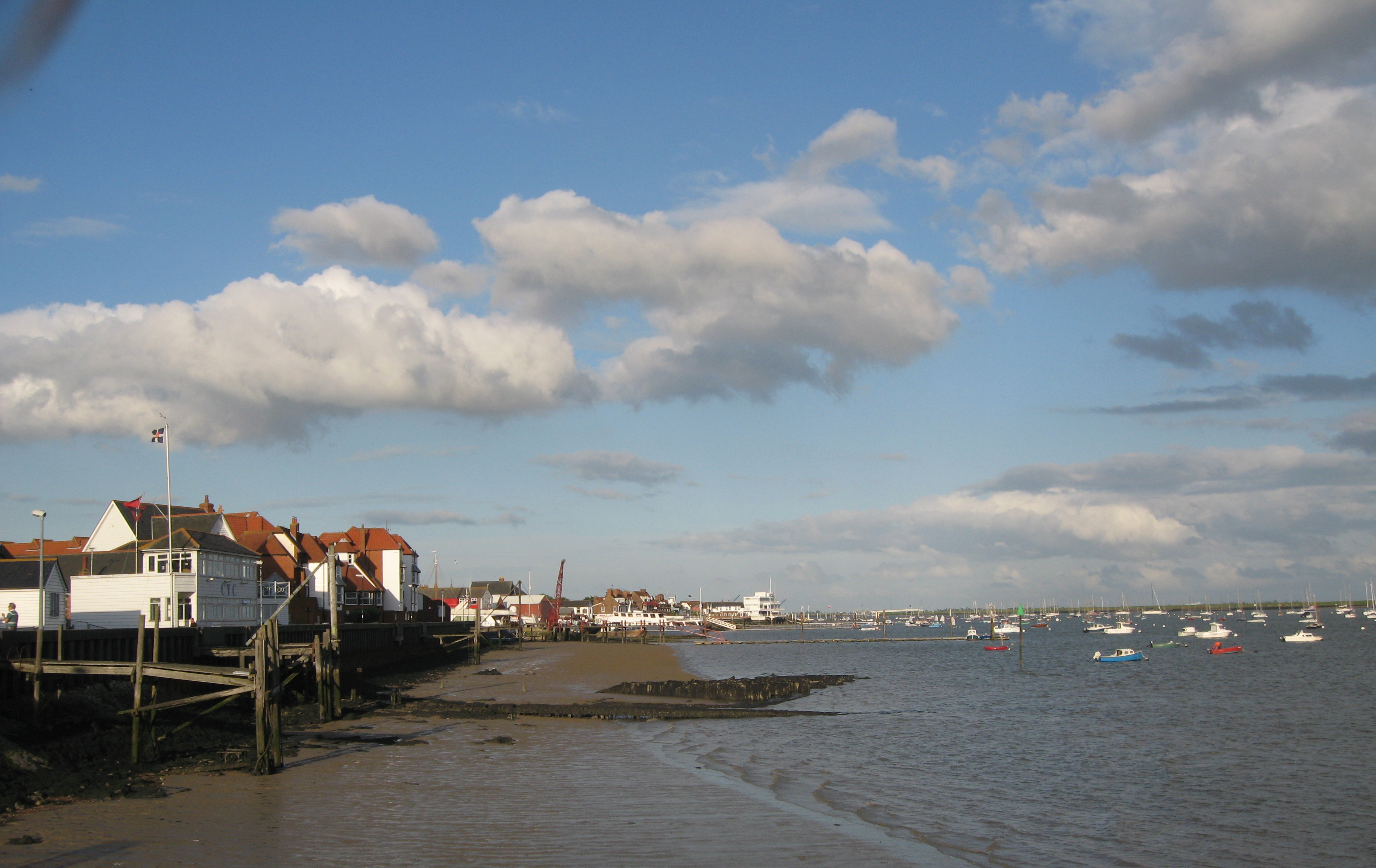 That is the Crouch Yacht Club on the far left (with the flag pole) facing the river, and the seawall of Burnham-on-Crouch beyond. Photo by me.