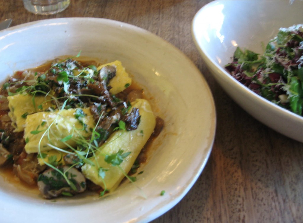 Wild mushrooms in pasta pillows with a rocket and parmesan salad. Photo by me