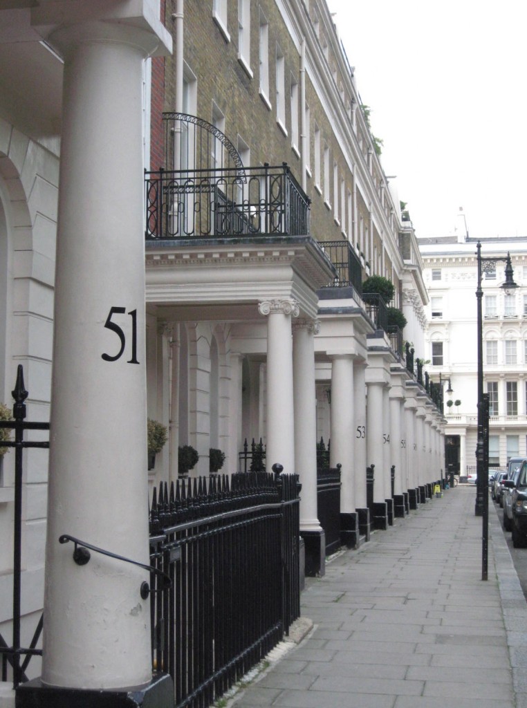 There are rows of lovely townhouses around green squares like this row at Eaton Square.