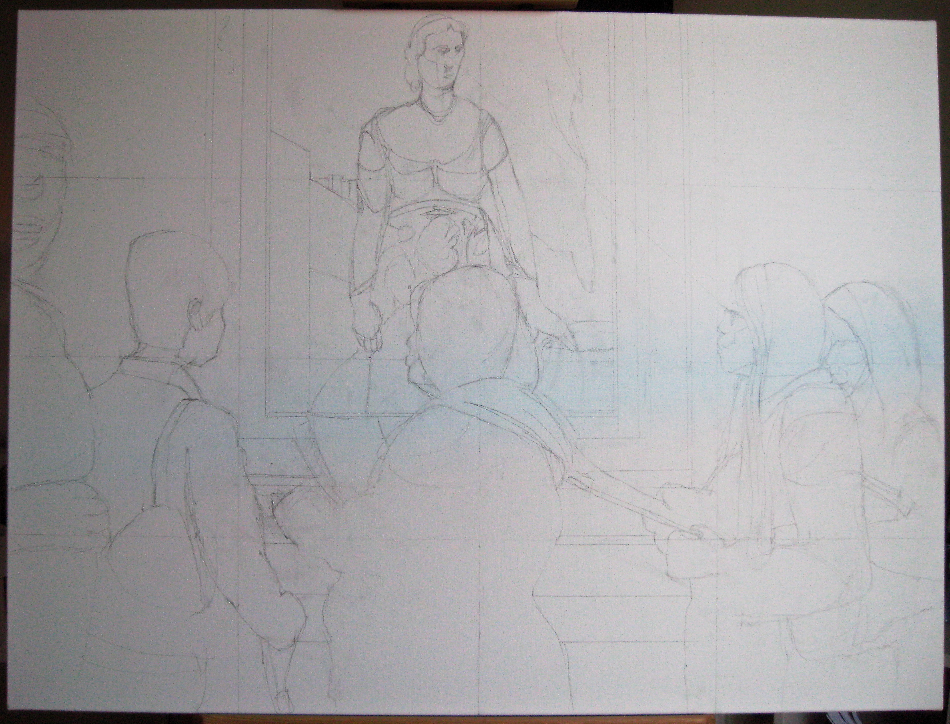 As I snapped away a man came rushing past the group. The perfect foil for their quiet study. They were at rest. I like to think I know them, although I can’t really. While I was painting them, I became part of the group, and we were all communicating with Agostina, a very soulful image.